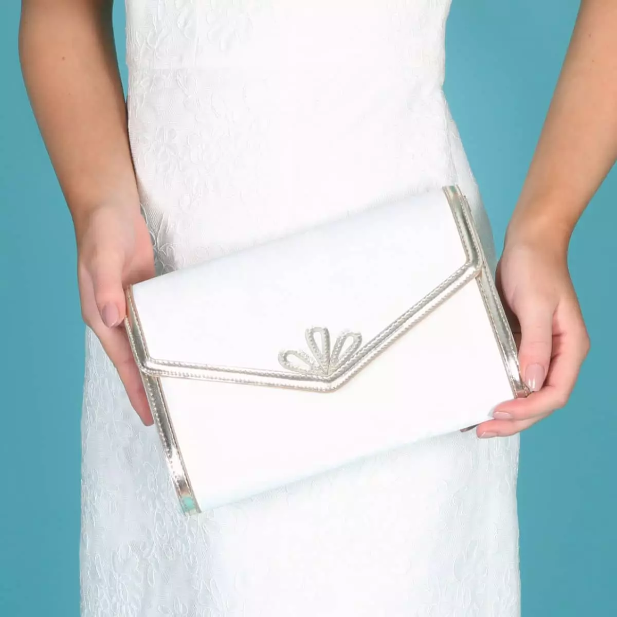 Die elegante Handtasche Clover von The Perfect Bridal Company ist aus hochwertigem Satin in Farbe Ivory mit gold schimmernden Rand gefertigt. Sie ist dank der mitgelieferten Schulterkette sehr stylisch und ergonomisch zugleich, da man sie so je nach Bedarf auch umhängen kann. Ein verdeckter Magnetverschluss rundet die Funktion als praktische Clutch ab. Zu dieser schönen Tasche empfehlen wir ein schlichtes Brautkleid in der Farbe Ivory (Elfenbeinfarbe), sowie Schmuck in der Farbe Gold.