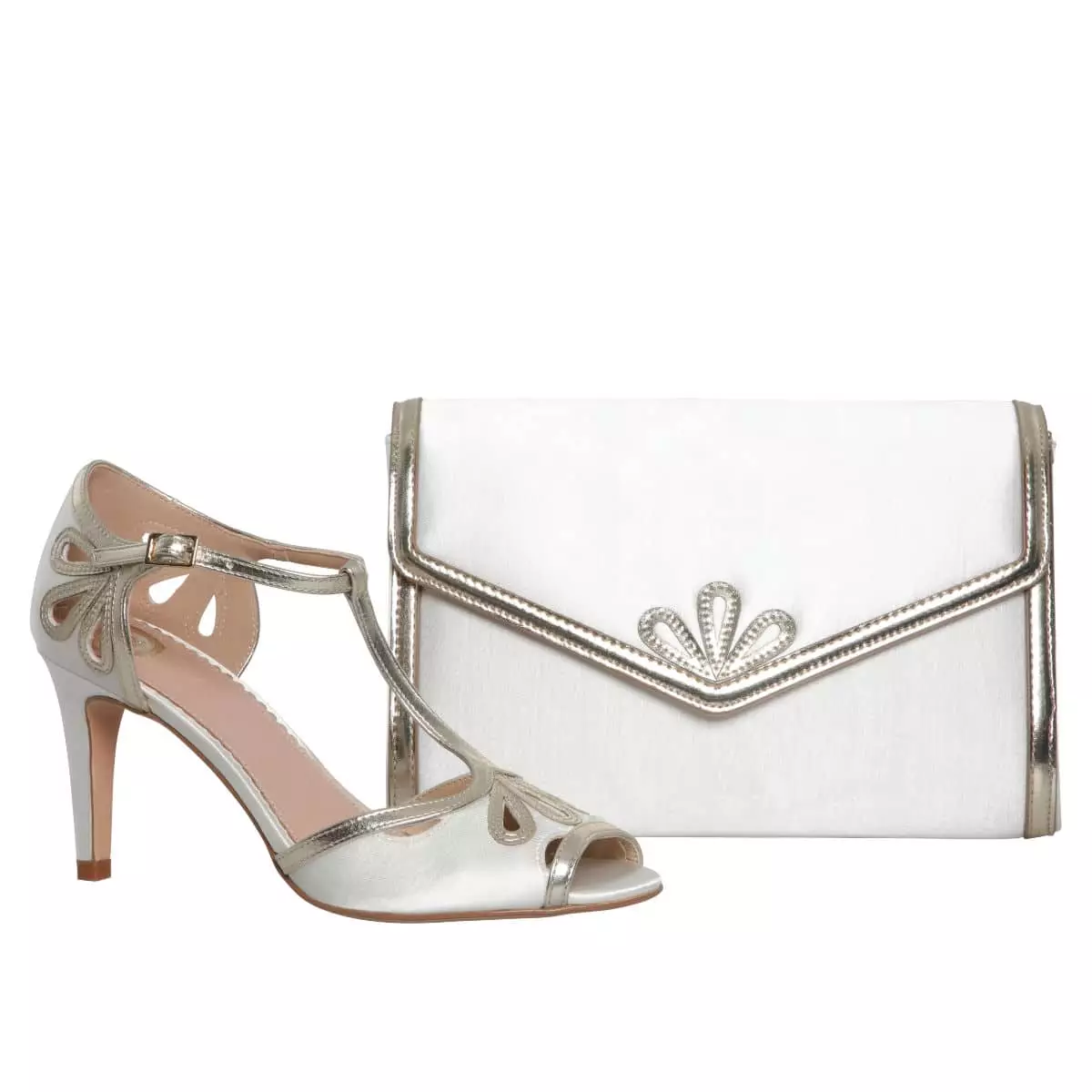 Passend zu der Brauttasche Clover empfehlen wir die Brautschuhe Esme, Harper oder Nina in der gold-ivory Ausführung.