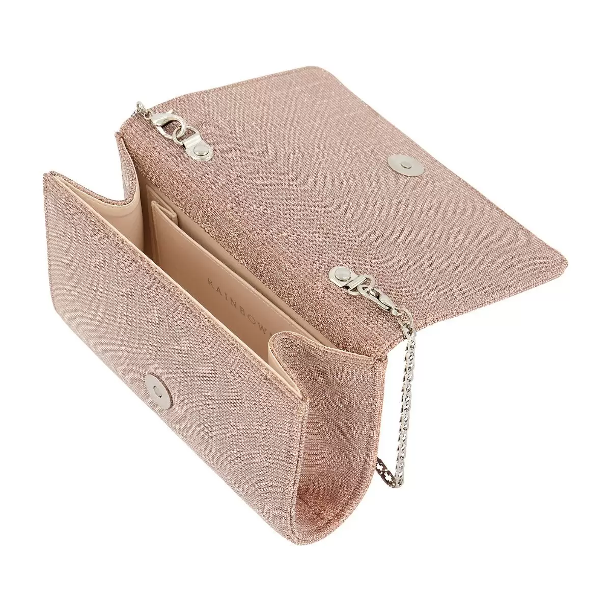 Exklusive Accessoires für die Braut mit hoher Qualität online kaufen. Wunderschöne Brauttasche Dafina Rose Metallic mit Glitzern aus hochwertigem Stoff. Die Brauttasche Dafina Rose Metallic von Rainbow Club ist in der Farbe Rose Metallic verfügbar und passt hervorragend zu einem Brautkleid in der Farbe Weiß oder Ivory. Es handelt sich um ein klassisches Clutch-Modell (Braut-Clutch). Die Brauttasche Dafina Rose Metallic mit Glitzern passt ideal zu einen Brautkleid in Farbe Weiß oder Ivory, kann aber auch zum Abendkleid, Abikleid, Ballkleid oder Verlobungskleid getragen werden.