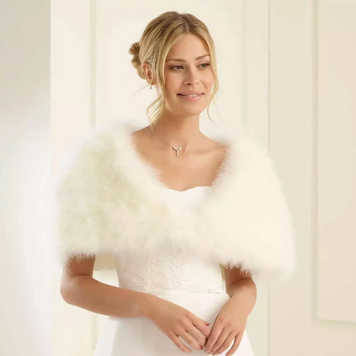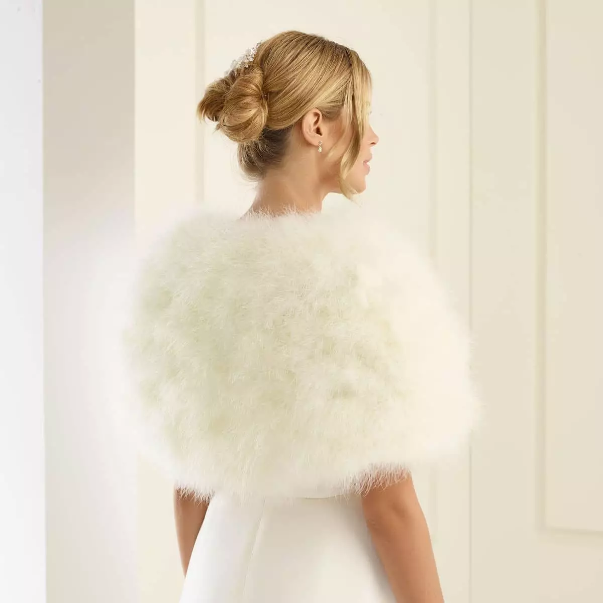 Stylisches Cape aus Marabufedern (Marabu Feder-Optik) ohne Ärmel in Universalgröße. Unterfutter des Capes ist aus Satin angefertigt. Das Cape hat eine Öse und Haken vorne zum Verschließen. Dieses Cape E184 von Avalia ist eine ideale Ergänzung zum Brautkleid in Farbe Ivory oder Weiß und ein exklusiver Accessoire für die Hochzeit. Hohe Qualität, sorgfältig entworfen und produziert in der Europäischen Union.
