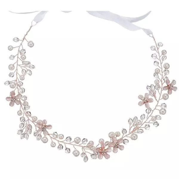 Der zarte Kopfschmuck HS-J4637RG mit Blumen in Rosé Gold von G. Westerleigh kommt als Haarband und ist mit Kristallen und Perlen verziert, welche in aufwändiger Handarbeit eingearbeitet wurden. Das Haarband verwandelt jede Frisur zu einer Traumfrisur. Dieser Kopfschmuck lässt sich ideal mit anderen Accessoires kombinieren und wirkt besonders schön mit einem Brautkleid, Abendkleid oder Kommunionkleid.