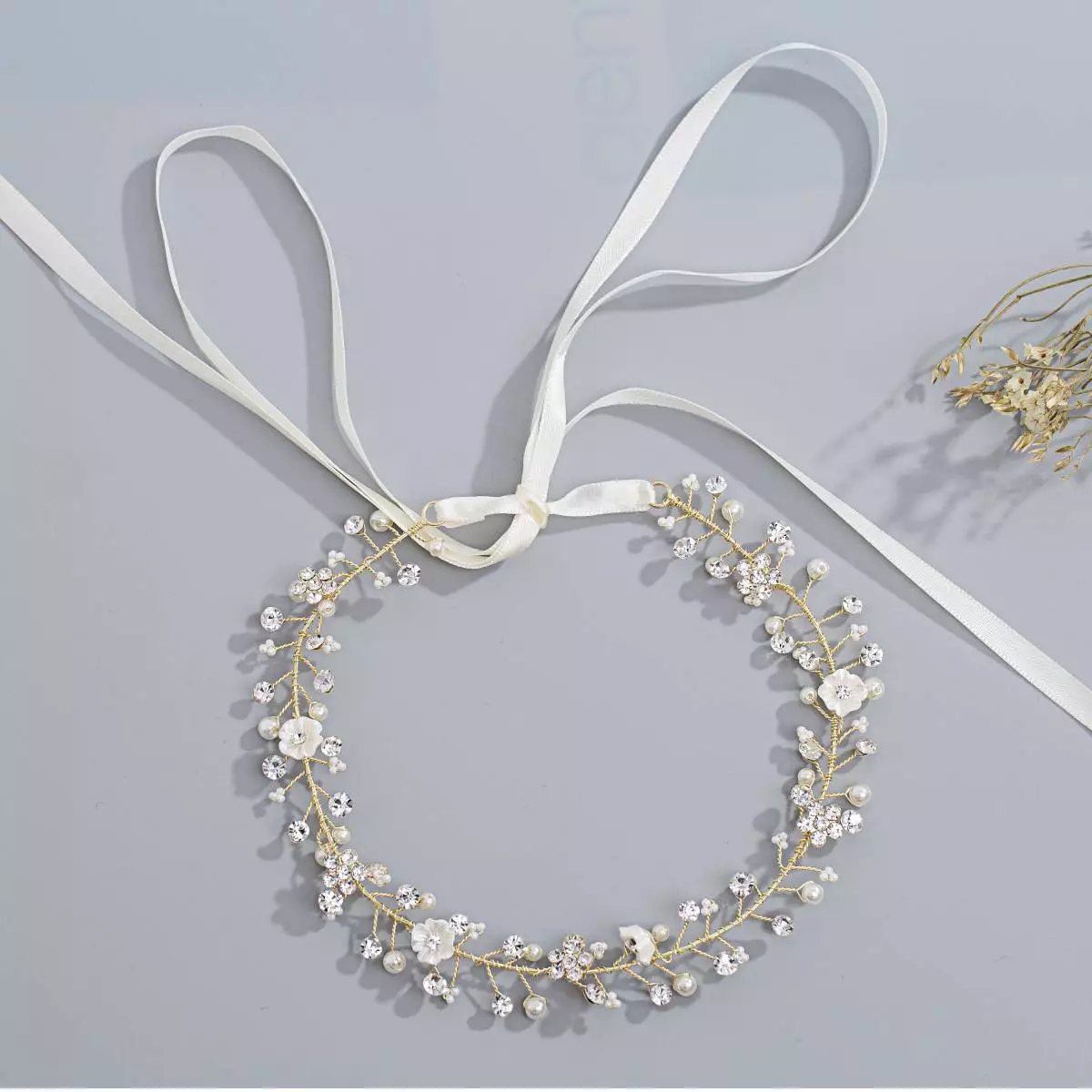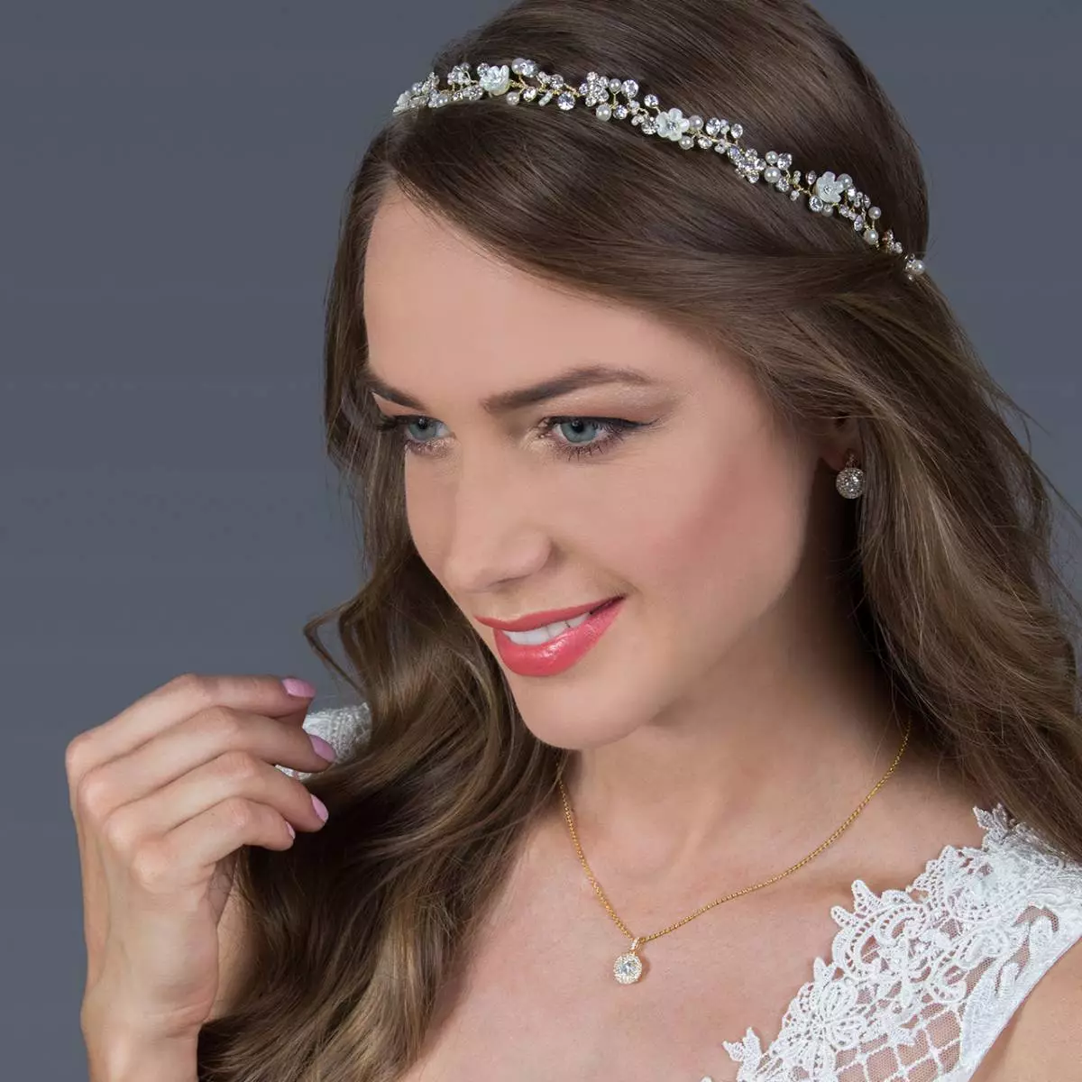 Der schöne Kopfschmuck ST1-5042 in Gold mit kleinen Ivory-Blumen von G. Westerleigh kommt als Haardraht und ist mit Kristallen verziert, welche in aufwändiger Handarbeit eingearbeitet wurden. Der Haardraht verwandelt jede Frisur zu einer Traumfrisur. Dieser Kopfschmuck lässt sich ideal mit anderen Accessoires kombinieren und wirkt besonders schön mit einem Brautkleid, Abendkleid oder Kommunionkleid. Passend zum Haarschmuck ST1-5042 empfehlen wir das Schmuckset DZ0563G und DZ0511G von G. Westerleigh.