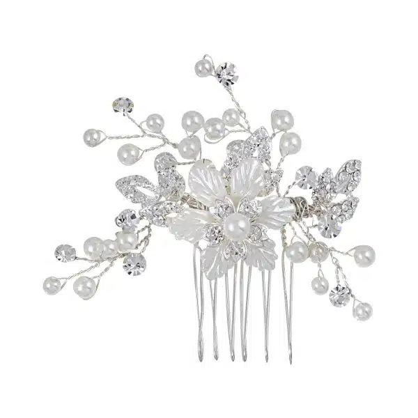 Der zarte Haarkamm FD1-11341 mit hochwertigen Strasssteinen von G. Westerleigh ist mit Kristallen und Perlen verziert, welche in aufwändiger Handarbeit eingearbeitet wurden. Der Kamm besteht aus nicht allergischen Materialien (nickel- und bleifrei) und ist mit Silber überzogen. Der Haarkamm sorgt für einen einzigartigen Haarlook. Dieser Kopfschmuck lässt sich ideal mit anderen Accessoires kombinieren und wirkt besonders schön mit einem Brautkleid oder Abendkleid.