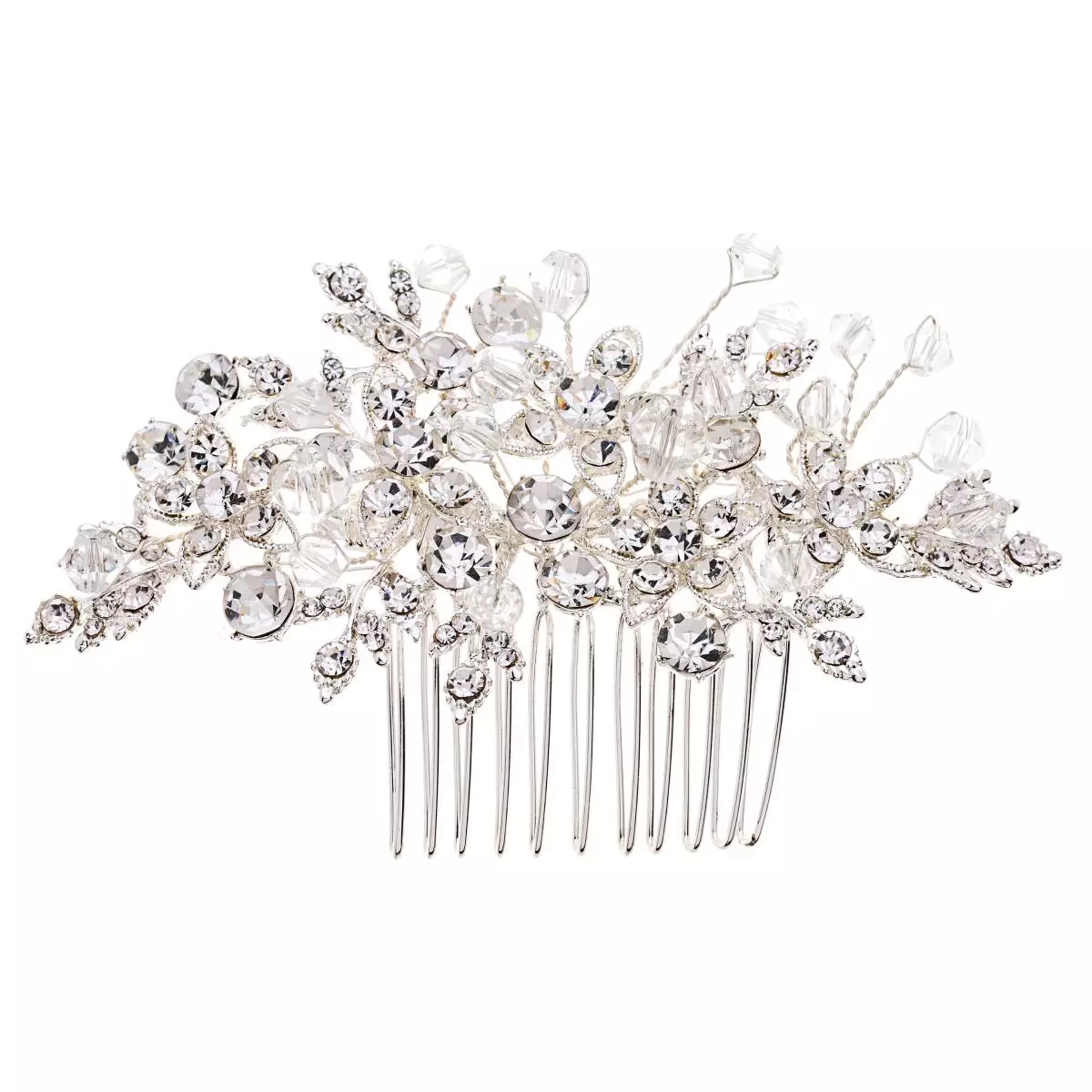 Der schöne Haarkamm FD1-1727 mit funkelnden Kristallen und Strass von G. Westerleigh ist mit Kristallen verziert, welche in aufwändiger Handarbeit eingearbeitet wurden. Der Kamm besteht aus nicht allergischen Materialien (nickel- und bleifrei) und ist mit Silber überzogen. Der Haarkamm sorgt für einen einzigartigen Haarlook. Dieser Kopfschmuck lässt sich ideal mit anderen Accessoires kombinieren und wirkt besonders schön mit einem Brautkleid oder Abendkleid.