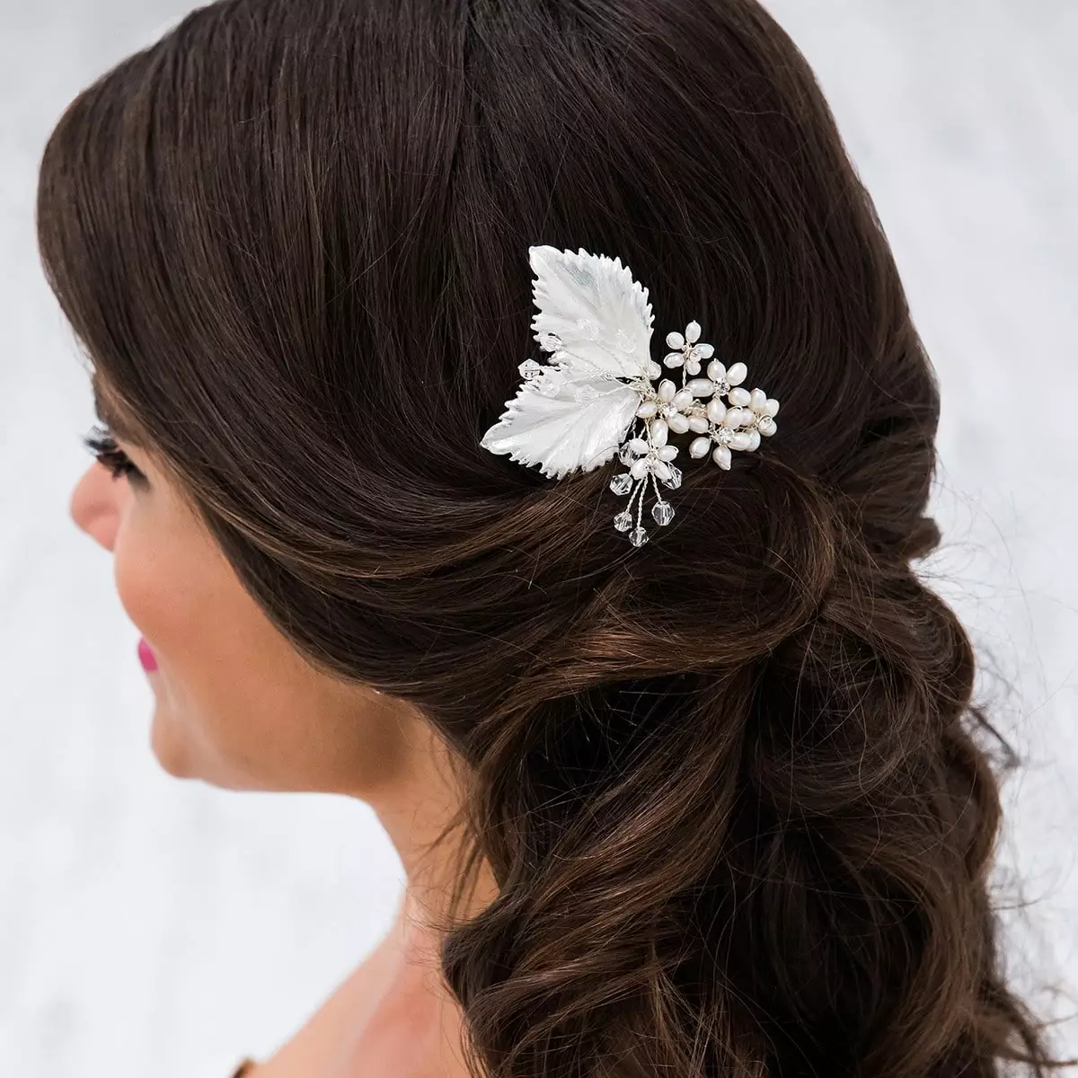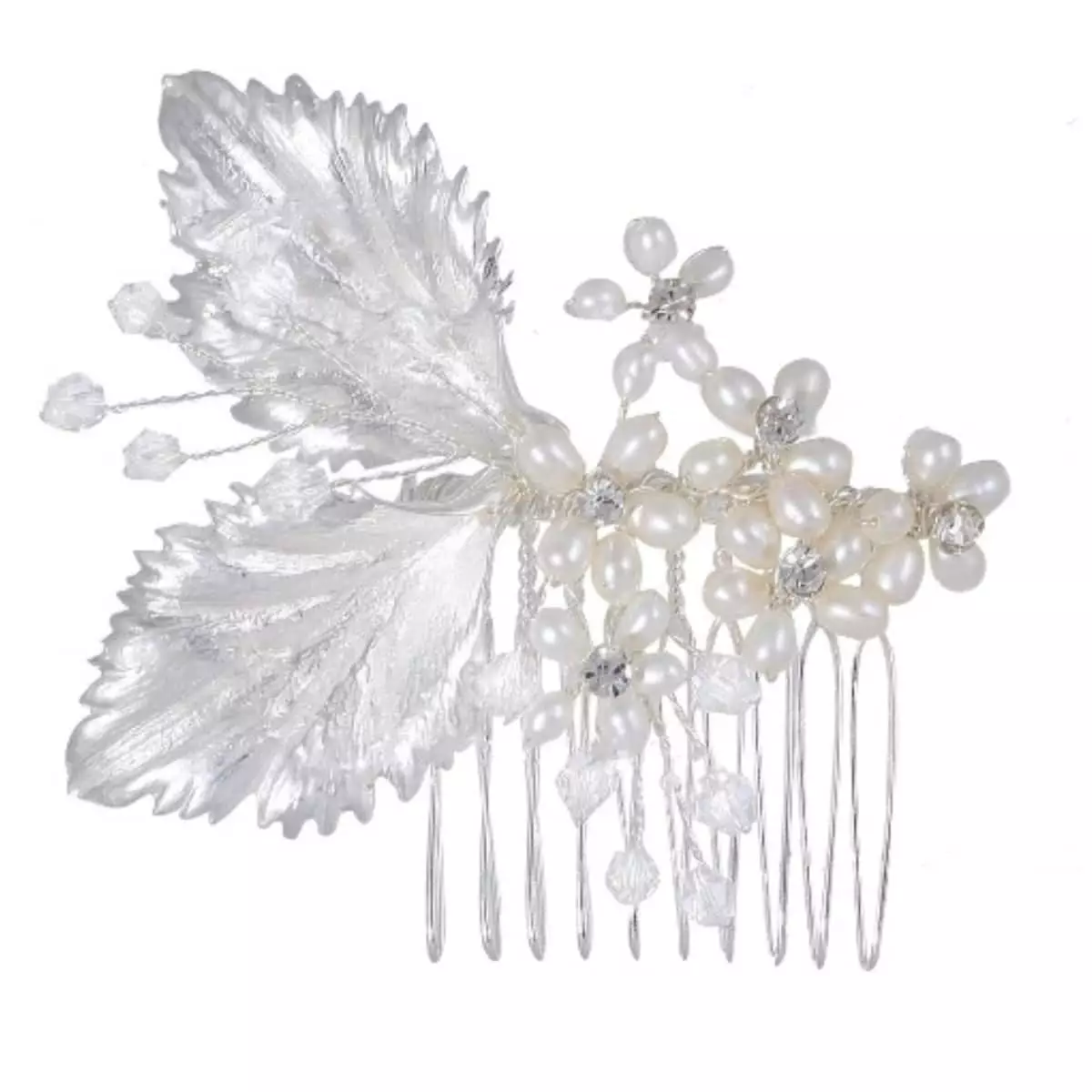 Der zarte Haarkamm J2661 im floralen Design mit Ivory-Perlen von G. Westerleigh ist mit Kristallen und Perlen verziert, welche in aufwändiger Handarbeit eingearbeitet wurden. Der Kamm besteht aus nicht allergischen Materialien (nickel- und bleifrei) und ist mit Silber überzogen. Der Haarkamm sorgt für einen einzigartigen Haarlook. Dieser Kopfschmuck lässt sich ideal mit anderen Accessoires kombinieren und wirkt besonders schön mit einem Brautkleid oder Abendkleid.