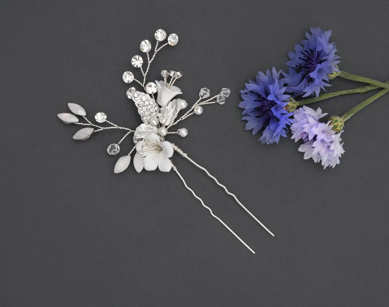 Wunderschöne Brauthaarnadel mit glitzernden Kristallen und Perlen. Sie ist versilbert.