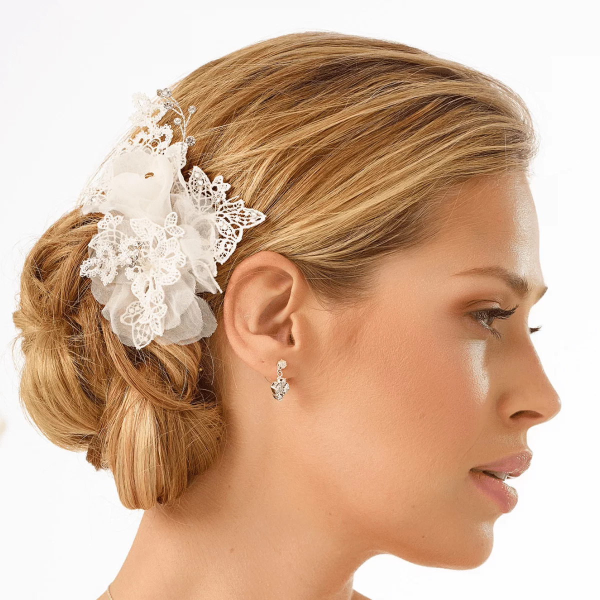 Dieser elegante Haarschmuck 4602 von Avalia (Bianco Evento) ist mit Stoff-Blüte, Spitze und Strasssteinen dekoriert. Dank des verbauten Kamms lässt sich der Haarschmuck 4602 einfach und schnell im Haar befestigen. Dieser Produkt ist hochwertig verarbeitet und ein wunderschönes Accessoire für dein Brautoutfit.