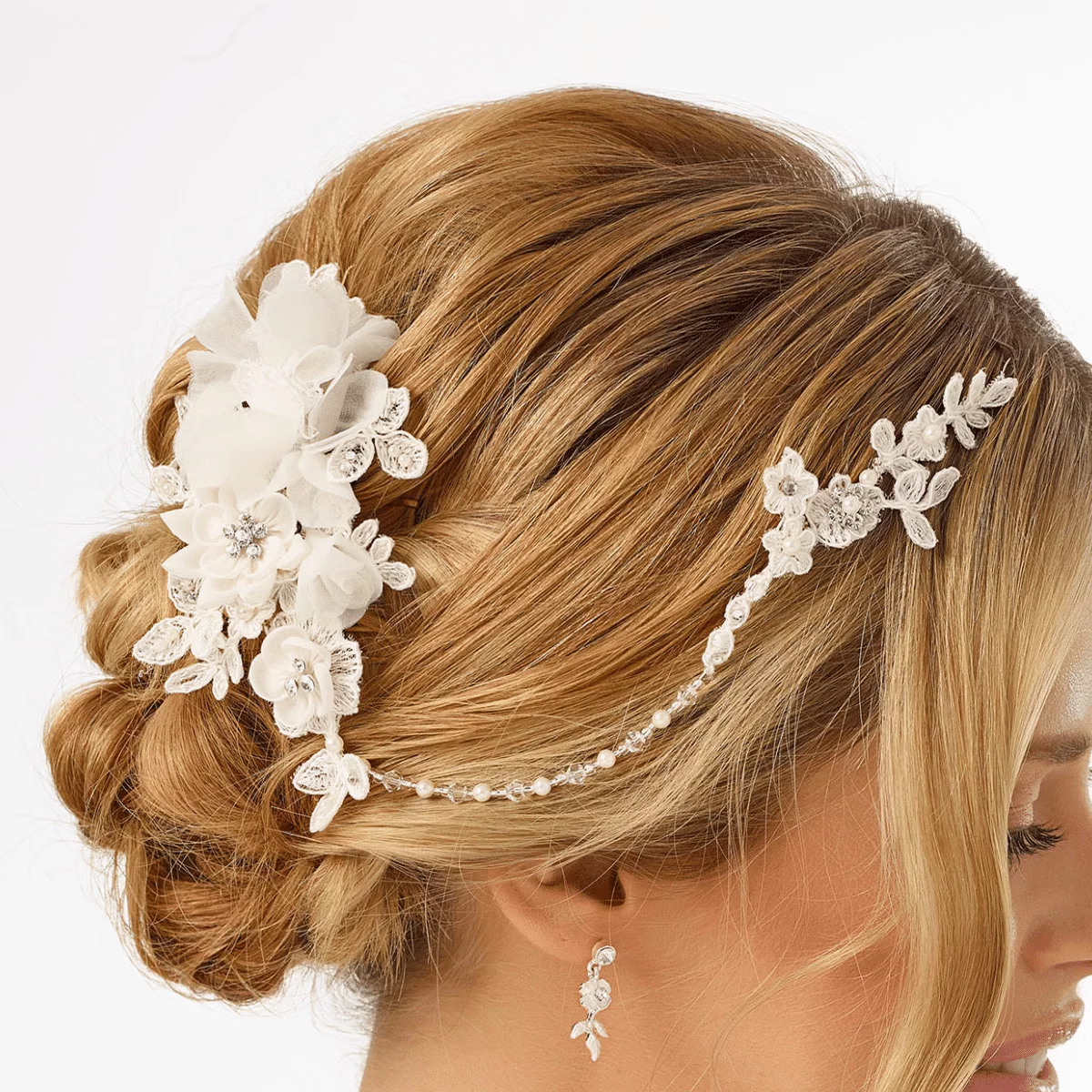 Dieser elegante Haarschmuck 7488 von Avalia (Bianco Evento) aus Spitze, Blumenapplikationen und Strass dekoriert. Dieser Produkt ist hochwertig verarbeitet und ein wunderschönes Accessoire für dein Brautoutfit.