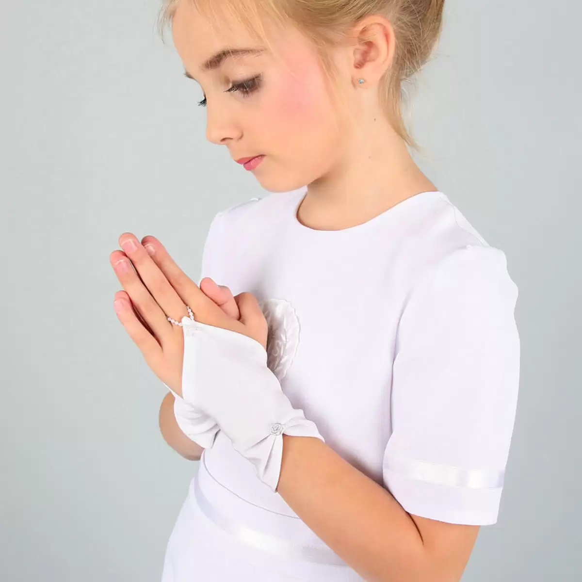 Wunderschöne fingerlose Kommunion-Handschuhe DK-H2 in der Farbe Weiß von Dalary. Mit kleinen Perlen und einer Blume verziert. Diese Kinderhandschuhe sind eine ideale Ergänzung zum Kommunion- oder Blumenmädchen-Outfit. Erhältlich in einer Universalgröße für Mädchen. Passend dazu gibt es unsere wunderschönen Kommunionkleider verschiedener Marken.