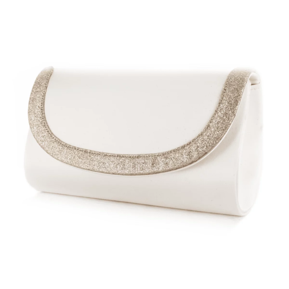Elegante Handtasche Marie Ivory-Champagne von White Lady. Hergestellt aus hochwertigem Satin in Farbe Ivory und mit goldfarbenen Glitzern vorne verziert. Dieses Accessoire ist als stylische Clutch für Events und Feiern oder als zarte Brauttasche für Hochzeiten bestens geeignet. Der Schnappverschluss mit einem Magnetdruckknopf ist sehr praktisch im Umgang und lässt sich fest verschließen, sodass die Tasche nicht selbstständig aufgehen kann. Zu dieser Tasche empfehlen wir ein schlichtes Brautkleid in der Farbe Ivory (Elfenbeinfarbe), sowie Schmuck in der Farbe Gold oder Champagne und Schuhe aus Satin mit goldfarbenen Elementen. Passende Brautschuhe sind zum Beispiel die Modelle 701, 838, 875 oder 882 von White Lady.