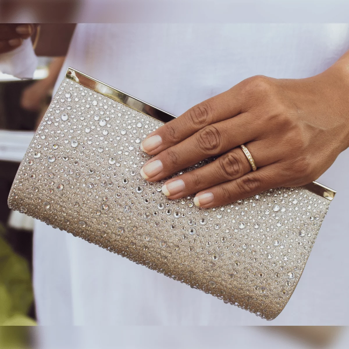 Elegante Handtasche Valentina Champagne-Zirkonia von White Lady. Diese Handtasche ist aus feinem Glitter gefertigt und mit Zirkonia-Steinen verziert. Ideal geeignet als Brauttasche oder Abend-Handtasche für Feierlichkeiten und Events. Der Schnappverschluss ist leicht zu handhaben und fest verschließbar, sodass die Tasche nicht selbstständig aufgehen kann. Passend zu der Handtasche Valentina Champagne-Zirkonia empfehlen wir die Schuhe aus der Kristall-Kollektion von White Lady (z.B. 920 oder 925). Die stilvolle Handtasche mit feinem Glitterbesatz in Farbe Champagne (Gold) lässt sich ideal mit Abendschuhen oder Brautschuhen in Farbe Champagne, Ivory oder Gold kombinieren.