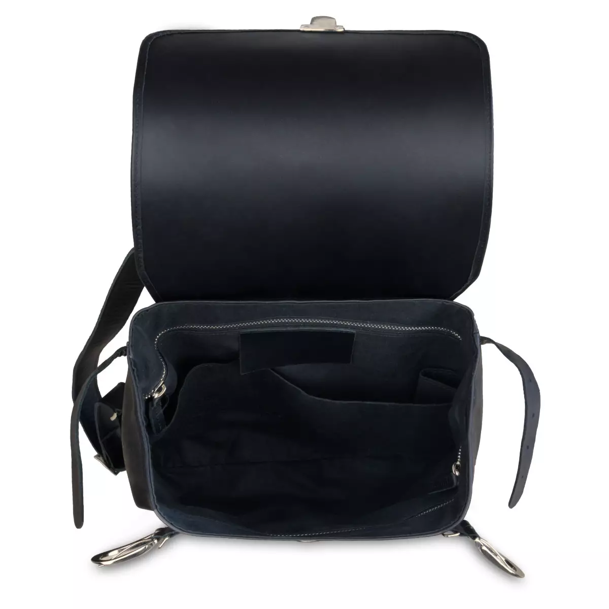 Der Rucksack lässt sich mit einer Lederklappe öffnen, die mit einem Tic-Tac-Toe-Verschluss versehen ist. Die Breite des Rucksacks wird durch Lederriemen mit seitlich eingenähten Schnallen reguliert. Im Inneren des Rucksacks befindet sich ein geräumiges Fach, in dem sich zusätzliche Taschen befinden. Zwei offene, in die ein Telefon und die nötigsten Kleinigkeiten passen. Und zwei Taschen an den gegenüberliegenden Seiten, die für wertvollere Gegenstände bestimmt sind und mit einem Metallreißverschluss geschlossen werden. Ein zusätzlicher Vorteil des Produkts ist eine große, individuell gestaltete Reißverschlusstasche auf der Rückseite des Rucksacks. Dank ihrer besonderen Lage bietet sie Schutz vor Diebstahl.
