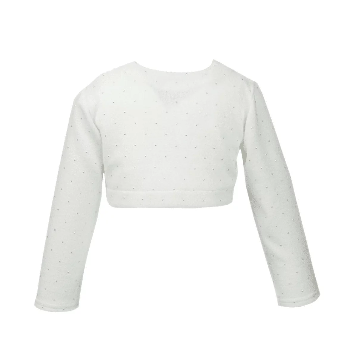 Bolerojacke mit silberfarbenen Kristallen für Mädchen DK-B12 von Dalary. Dieser Bolero ist aus hochwertiger Wolle gefertigt und kommt in der Farbe Ivory (Elfenbeinfarbe). Dank der Verzierung mit kleinen Kristallsteinen wirkt die Bolerojacke DK-B12 besonders elegant. Sie spendet Wärme an kalten Tagen und lässt sich ideal mit einem Kleid in der Farbe Ivory, Weiß und in anderen Farben kombinieren. Für die Erstkommunion oder Hochzeitsfeier empfehlen ein passendes Kommunionkleid oder Blumenmädchen-Kleid von Dalary oder einem anderen Hersteller. Dieser Bolero eignet sich natürlich auch für andere Anlässe und lässt sich mit nahezu jedem Mädchenkleid kombinieren.