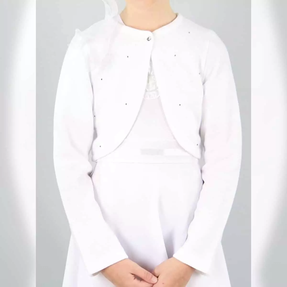 Dieser schöne Bolero DK-B16 von Dalary überzeugt durch hochwertige Verarbeitung und ausgezeichnete Materialien. Hergestellt aus hochwertigem gestreiftem Stoff in Farbe Weiß und mit kleinen Kristallsteinen veredelt. Der Bolero passt ideal zu jedem Kommunion- oder Blumenmädchen-Kleid in der Farbe Weiß und spendet kuschelige Wärme an kalten Tagen.