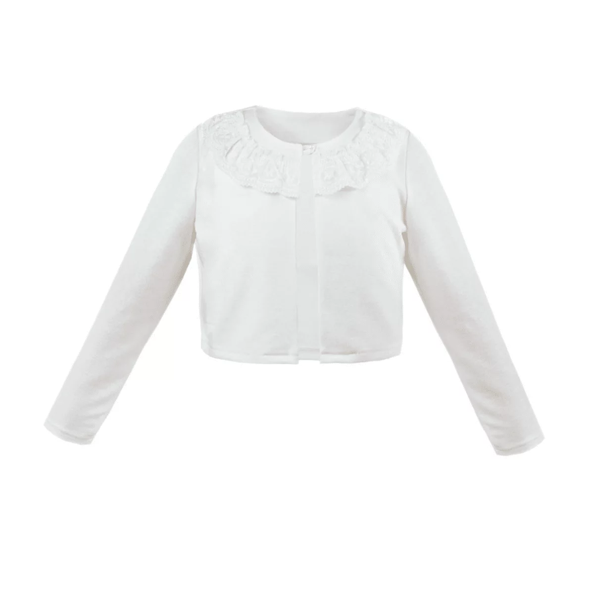 Schöner Bolero-Pulli für Mädchen DK-B4 von Dalary. Dieser Bolero besteht aus hochwertigem Satin mit einer Spitzenrüsche und ist in den Farben Weiß und Ivory (Elfenbeinfarbe) verfügbar. Er spendet kuschelige Wärme bei wechselhaftem Wetter in den Frühling- und Herbstmonaten. Für die Bequemlichkeit sorgt ein Knopfverschluss am Hals. Wir empfehlen ein passendes Kommunionkleid, welches ebenfalls in den Farben Ivory und Weiß verfügbar ist. Der Bolero DK-B4 kann zur Hochzeit mit einem Blumenmädchen-Kleid oder bei anderen Feierlichkeiten zusammen mit einem Kleid in beliebiger Farbe getragen werden.