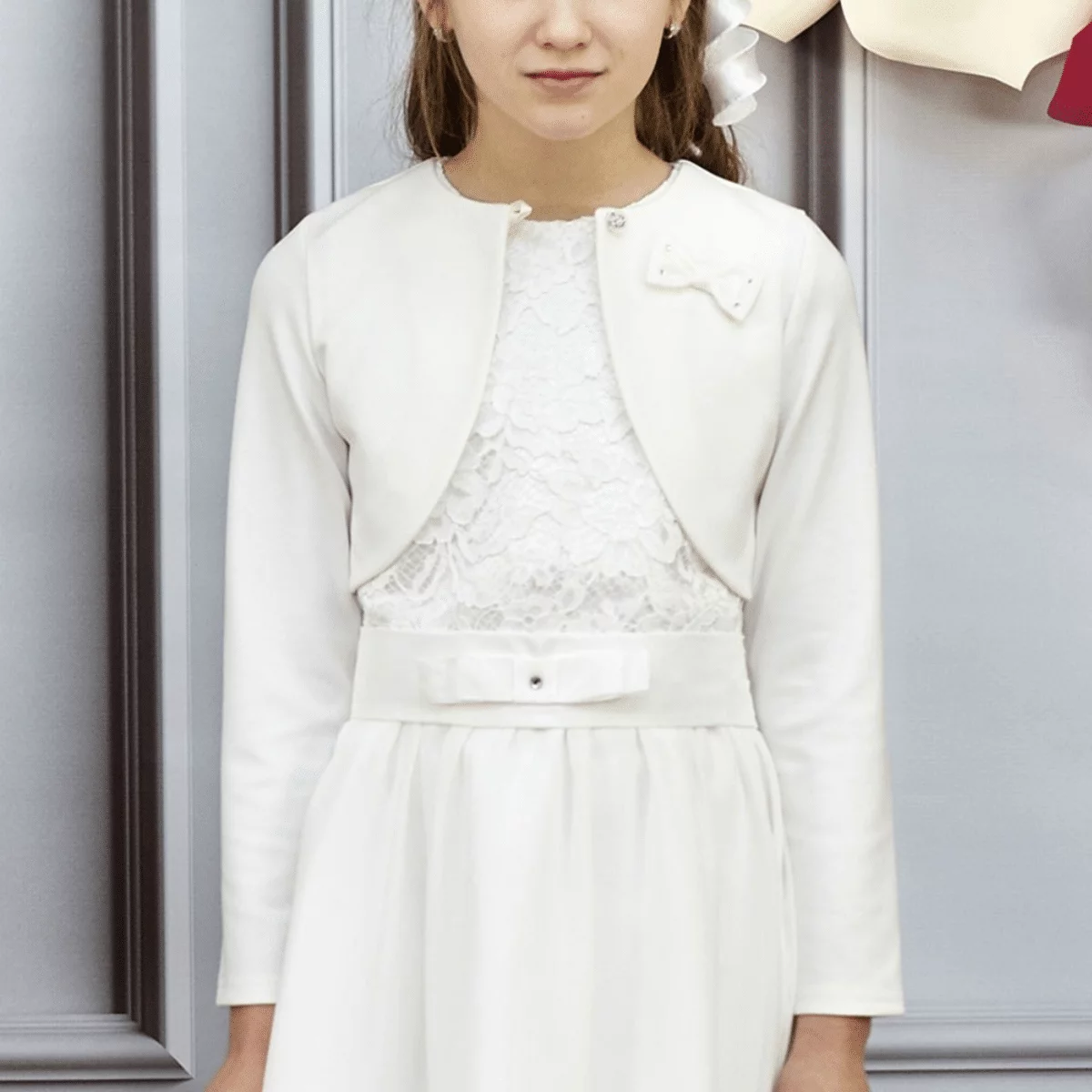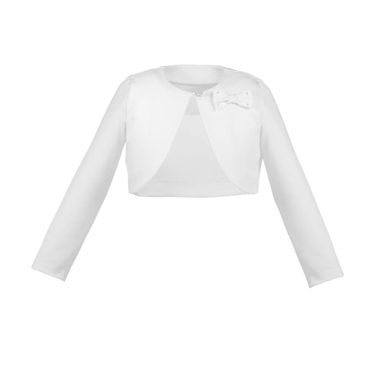 Wunderschöner Bolero für Mädchen DK-B8 von Dalary. Dieser Bolero ist aus hochwertiger Wolle gefertigt und in den Farben Weiß und Ivory (Elfenbeinfarbe) verfügbar. Vorne ziert eine zarte Schleife mit Zirkonia Kristallen sowie ein Knopf die Bolerojacke. Für Wärme an kalten Tagen sorgt dieses Accessoire und lässt sich ideal mit einem Kleid in passender Farbe kombinieren. Wir empfehlen ein passendes Kommunionkleid, welches ebenfalls in den Farben Ivory und Weiß verfügbar ist. Der Bolero DK-B8 kann zur Hochzeit mit einem Blumenmädchen-Kleid oder bei anderen Feierlichkeiten zusammen mit einem Kleid in beliebiger Farbe getragen werden.