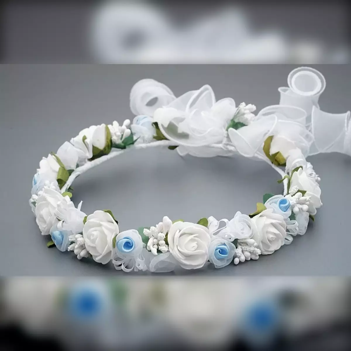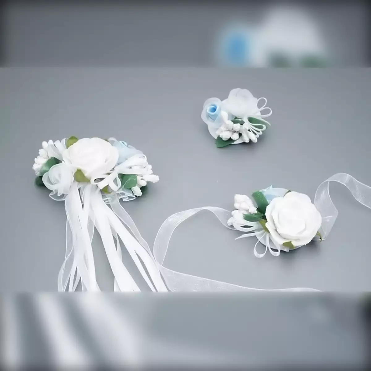 Kommunion-Set Dalary DK-SET102 bestehend aus Haarkranz, Handschmuck, Kerzenschmuck und Dekor für die Handtasche. Verziert mit weißen und blauen Blumen und Blüten. Bezauberndes Schmuckset für die Erstkommunion und für Blumenmädchen.