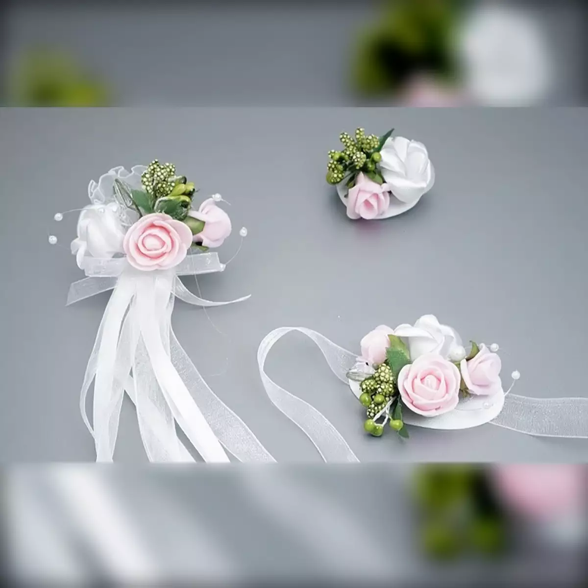 - Besteht aus: Haarkranz, Handschmuck, Kerzenschmuck und Dekor für die Handtasche
