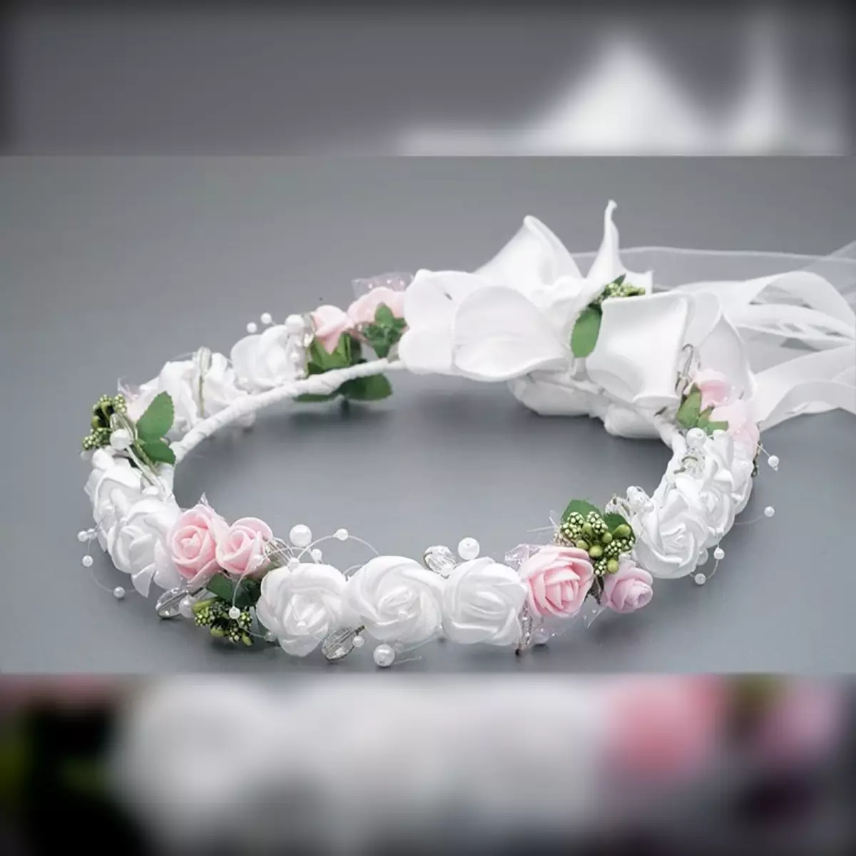 Kommunion-Set Dalary DK-SET107 bestehend aus Haarkranz, Handschmuck, Kerzenschmuck und Dekor für die Handtasche. Verziert mit weißen und rosa Blumen, Blüten, kleinen Perlen und Strass. Wunderschönes Schmuckset für die Erstkommunion und für Blumenmädchen.