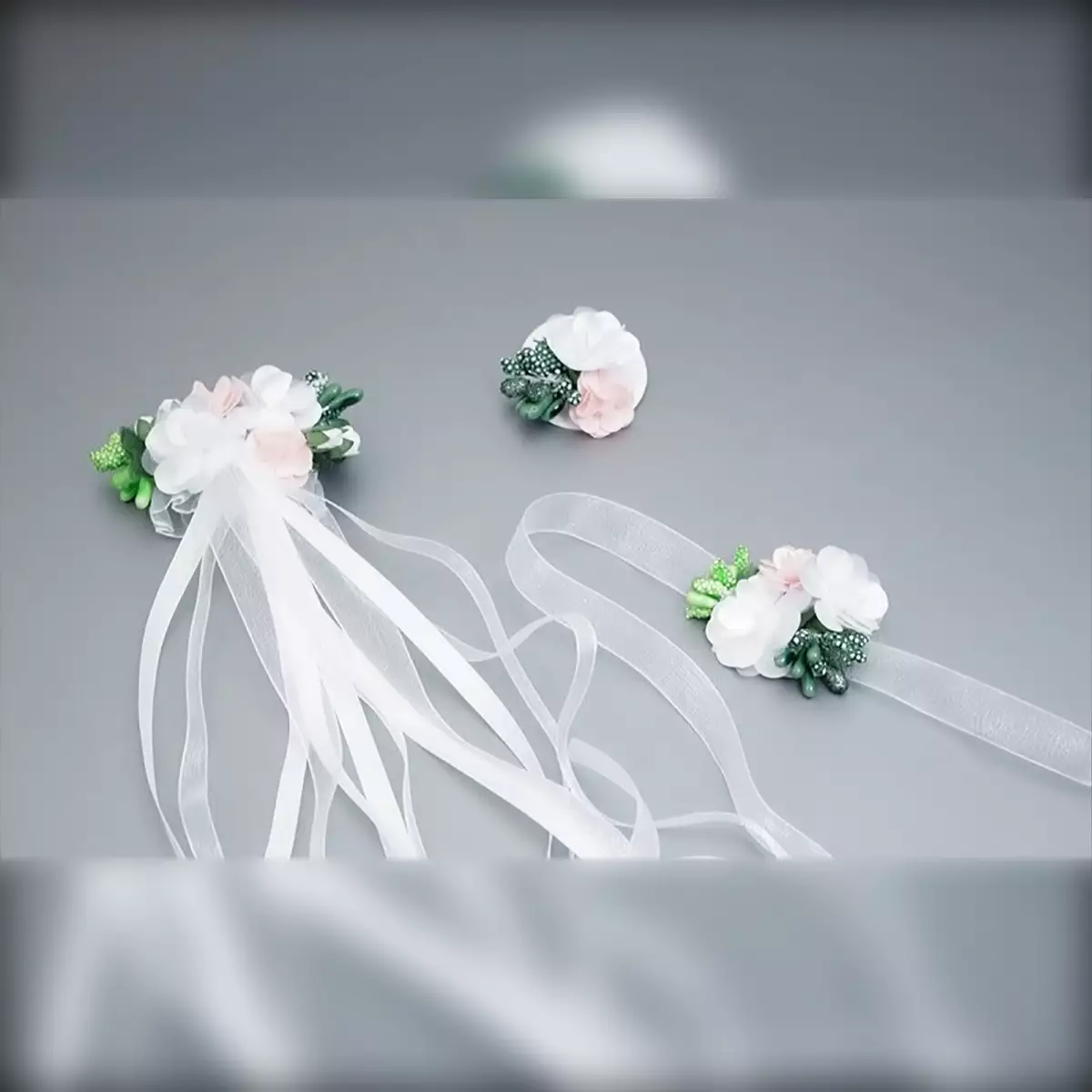 - Besteht aus: Haarkranz, Handschmuck, Kerzenschmuck und Dekor für die Handtasche