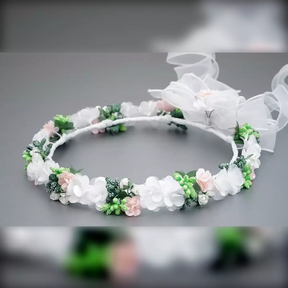 Kommunion-Set Dalary DK-SET79 bestehend aus Haarkranz, Handschmuck, Kerzenschmuck und Dekor für die Handtasche. Verziert mit weißen und rosa Blumen und grünen Blüten. Wunderschönes Schmuckset für die Erstkommunion und für Blumenmädchen.