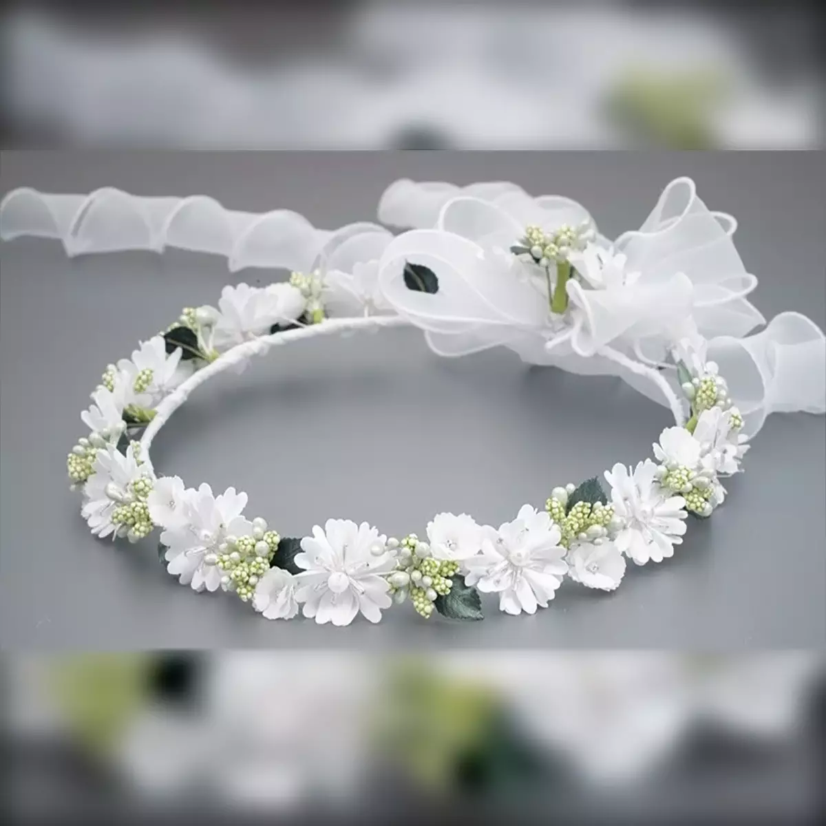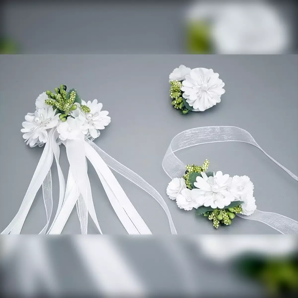 Kommunion-Set Dalary DK-SET89 bestehend aus Haarkranz, Handschmuck, Kerzenschmuck und Dekor für die Handtasche. Verziert mit weißen Blumen und grünen Blüten. Eine ideale Ergänzung zum Kommunion- oder Blumenmädchen-Outfit!