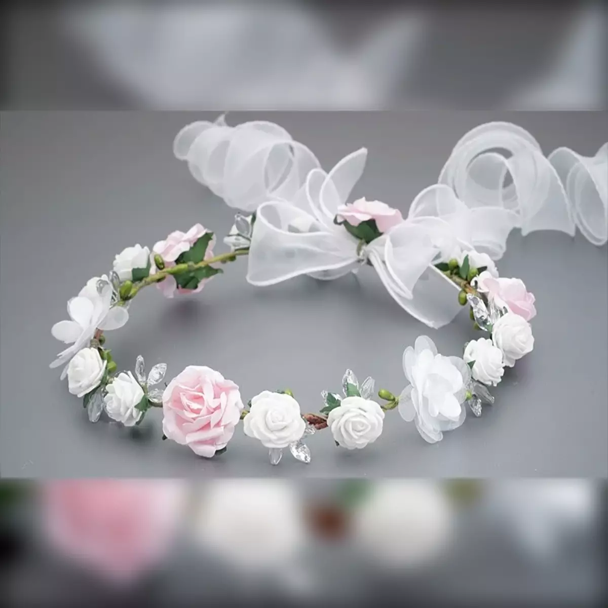 Kommunion-Set Dalary DK-SET92 bestehend aus Haarkranz, Handschmuck, Kerzenschmuck und Dekor für die Handtasche. Verziert mit weißen und rosa Blumen, Blüten und Kristallsteinen. Wunderschönes Schmuckset für die Erstkommunion und für Blumenmädchen.