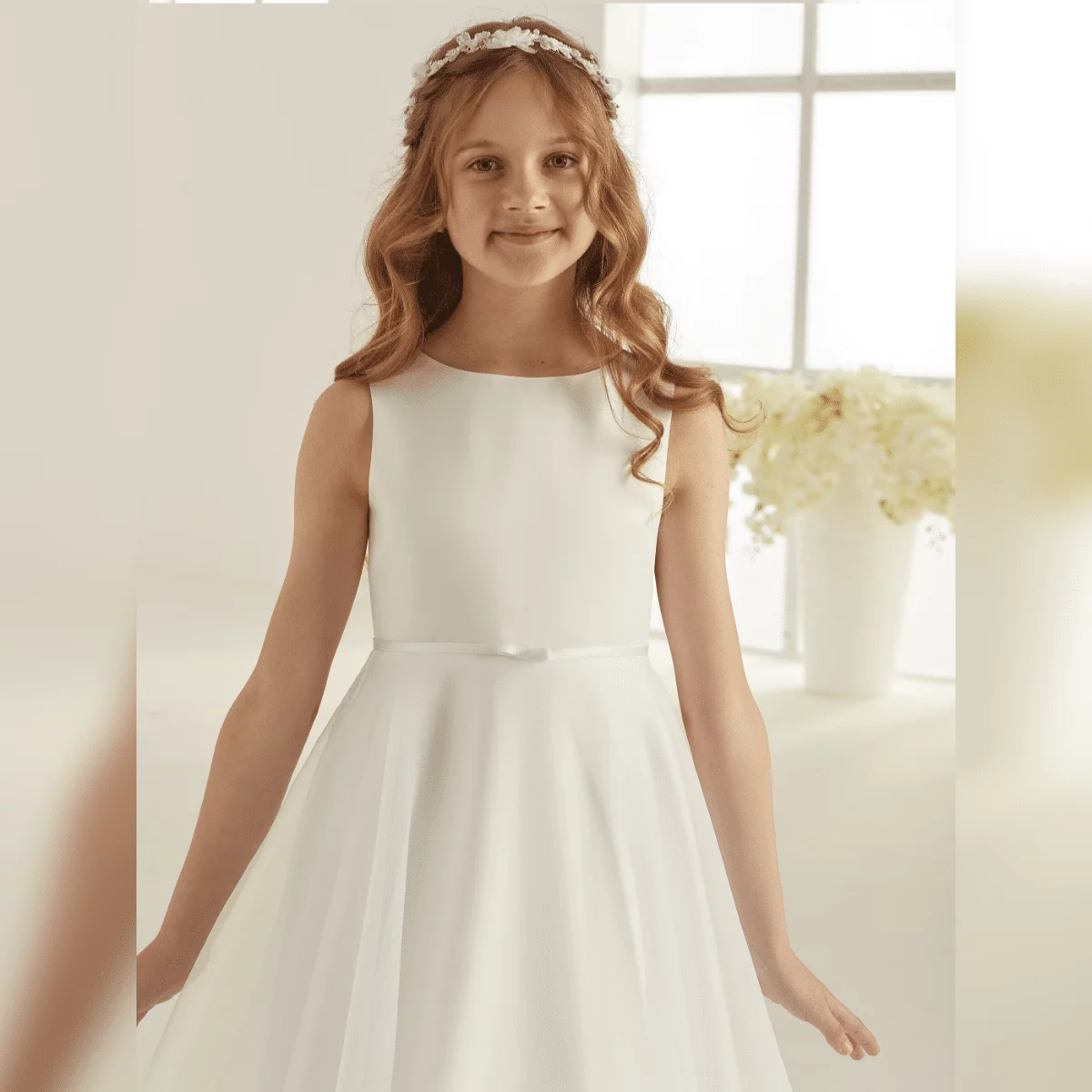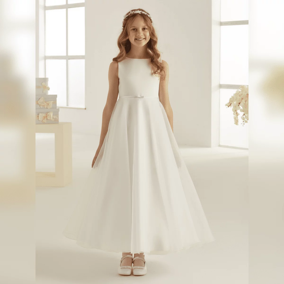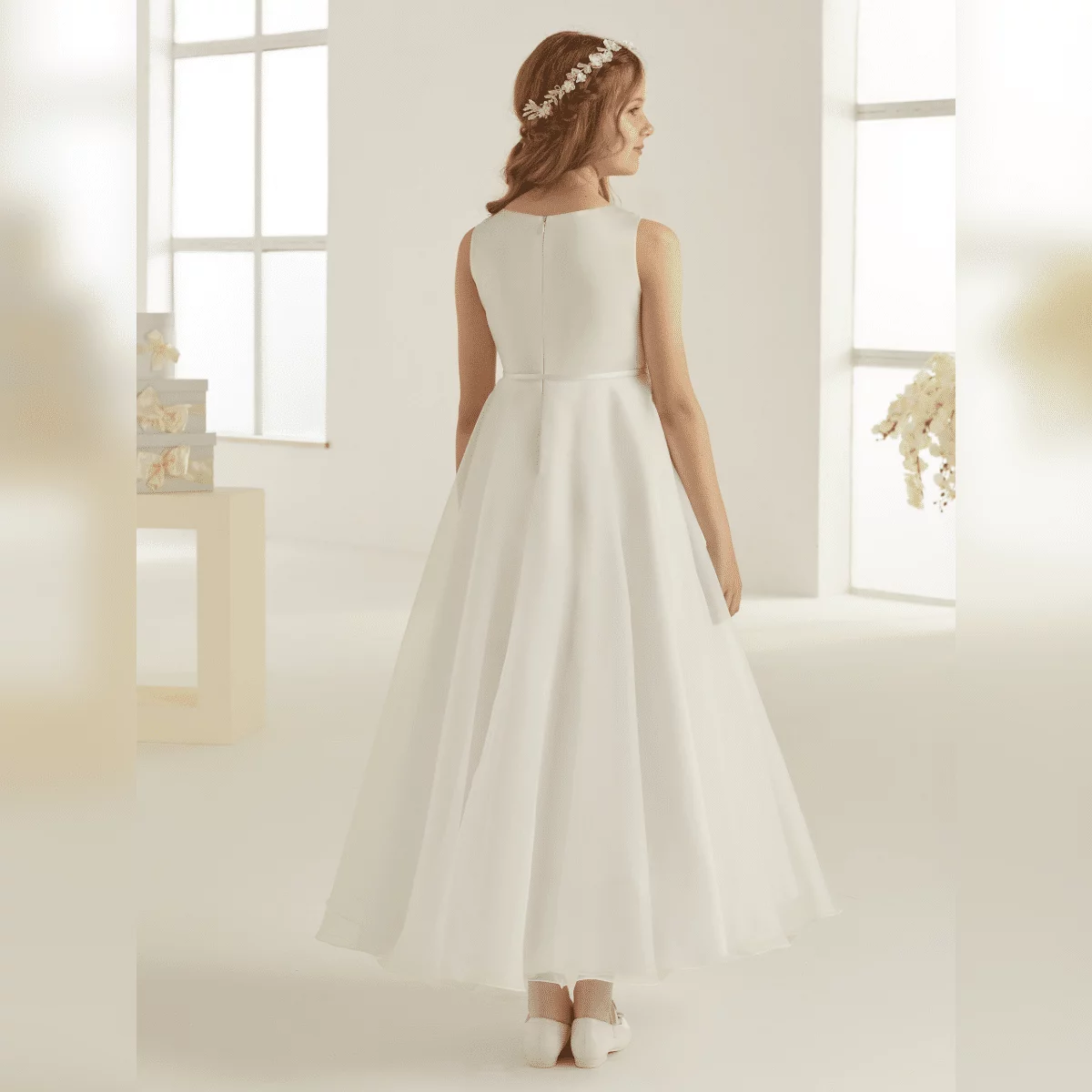 Schönes Kommunionkleid ME1900 der Firma Avalia mit kurzen Ärmeln. Dieses Kommunionkleid kommt wahlweise in der Farbe Weiß oder Ivory (Creme) und ist aus hochwertigem Satin und feiner Organza hergestellt. Der süße Gürtel aus Satin in Farbe Ivory ergänzt das Kleid ideal. Die Farbe Ivory ist ein Weißton mit einem Schimmer Beige und gilt zusammen mit der Farbe Weiß bei den Christen als Farbe der Ewigkeit. Ein Reißverschluss sorgt für ein bequemes An- und Ausziehen des Kleides und ist nahezu unsichtbar auf der Rückseite des Kleides angebracht. Mit dem Kleid ME1900 von Avalia (Bianco Evento) wird sich jedes Mädchen am Tag der Kommunion wohl fühlen und wunderschön aussehen.