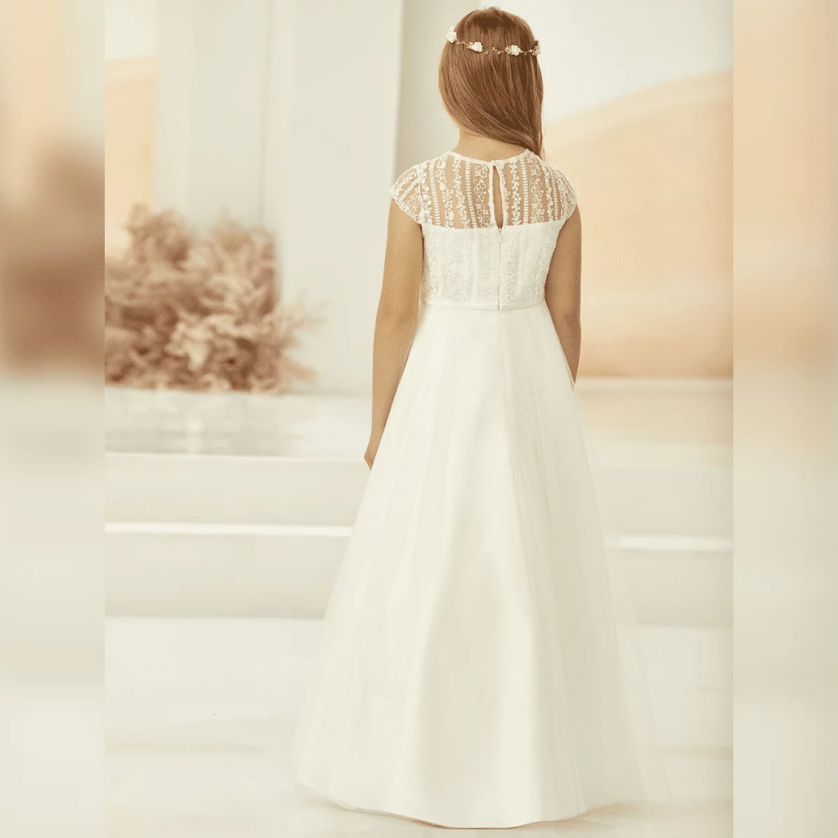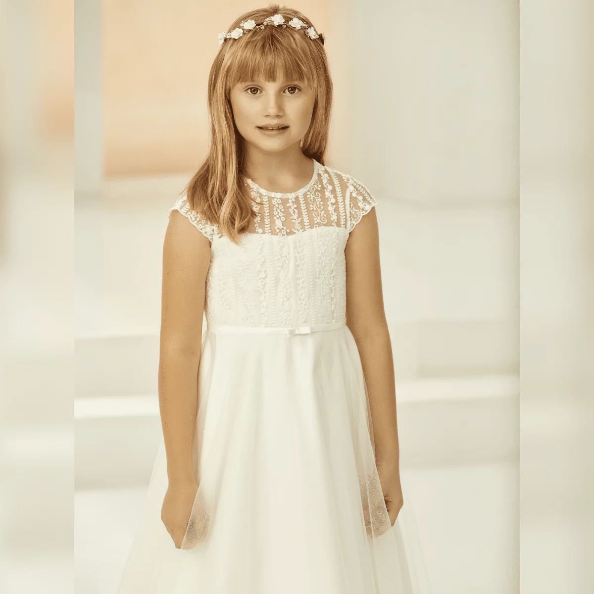 Schönes Kommunionkleid ME2000 der Firma Avalia ohne Ärmel. Dieses Kommunionkleid kommt in der Farbe Ivory (Creme) und ist aus hochwertiger Spitze und feinem Tüll mit Glitzern hergestellt. Die Farbe Ivory ist ein Weißton mit einem Schimmer Beige und gilt bei den Christen als Farbe der Ewigkeit. Ein Reißverschluss sorgt für ein bequemes An- und Ausziehen des Kleides und ist nahezu unsichtbar auf der Rückseite des Kleides angebracht. Mit dem Kleid ME2000 von Avalia (Bianco Evento) wird sich jedes Mädchen am Tag der Kommunion wohl fühlen und wunderschön aussehen.