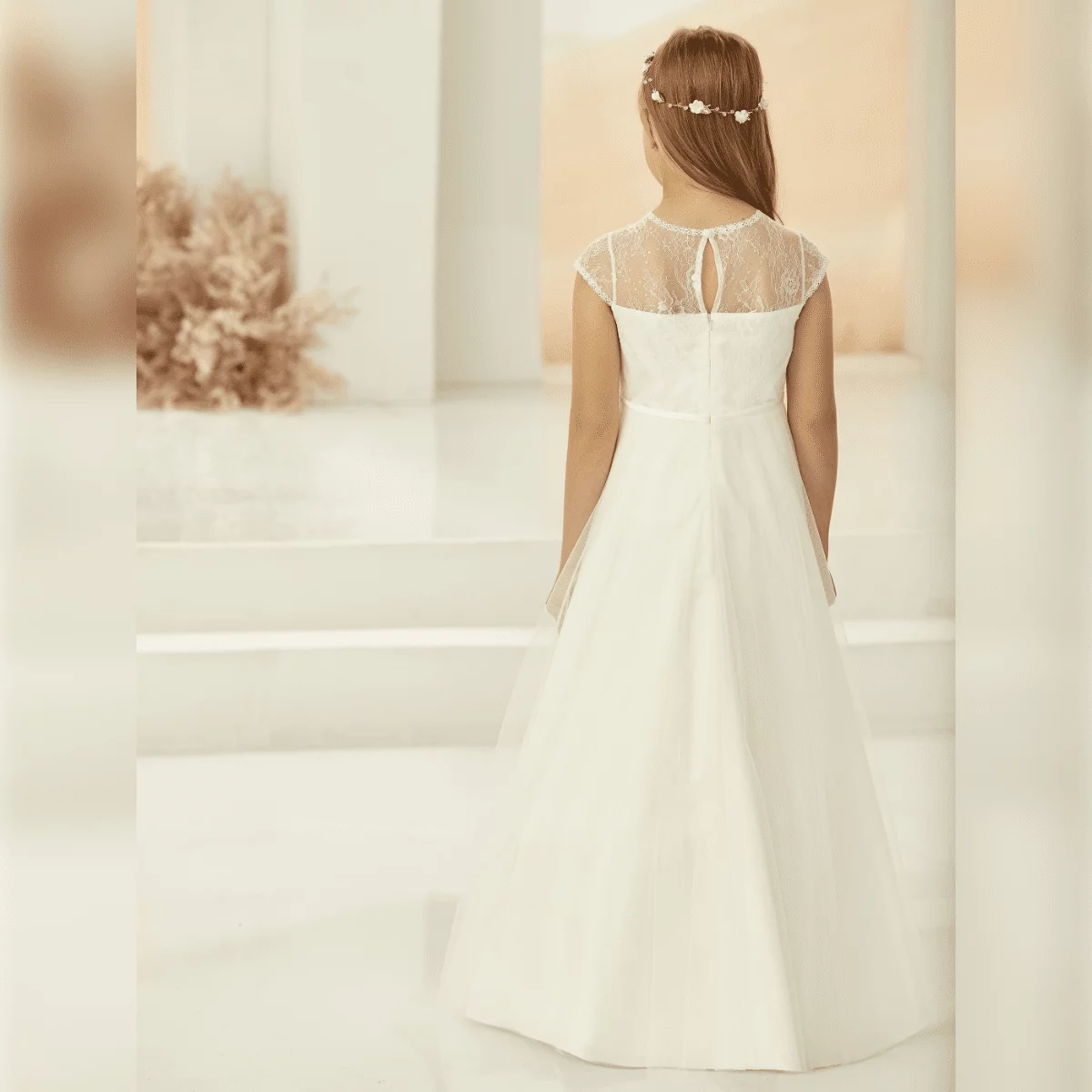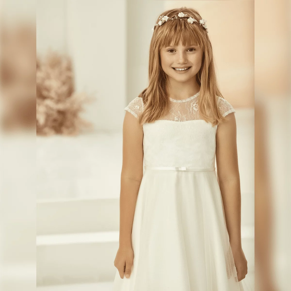 Schönes Kommunionkleid ME2200 der Firma Avalia ohne Ärmel. Dieses Kommunionkleid kommt in der Farbe Ivory (Creme) und ist aus hochwertiger Spitze, feinem Tüll und Organza hergestellt. Der süße Gürtel aus Satin in Farbe Ivory ergänzt das Kleid ideal. Die Farbe Ivory ist ein Weißton mit einem Schimmer Beige und gilt bei den Christen als Farbe der Ewigkeit. Die Knöpfe sorgen für ein bequemes An- und Ausziehen des Kleides und sind nahezu unsichtbar auf der Rückseite des Kleides angebracht. Mit dem Kleid ME2200 von Avalia (Bianco Evento) wird sich jedes Mädchen am Tag der Kommunion wohl fühlen und wunderschön aussehen.