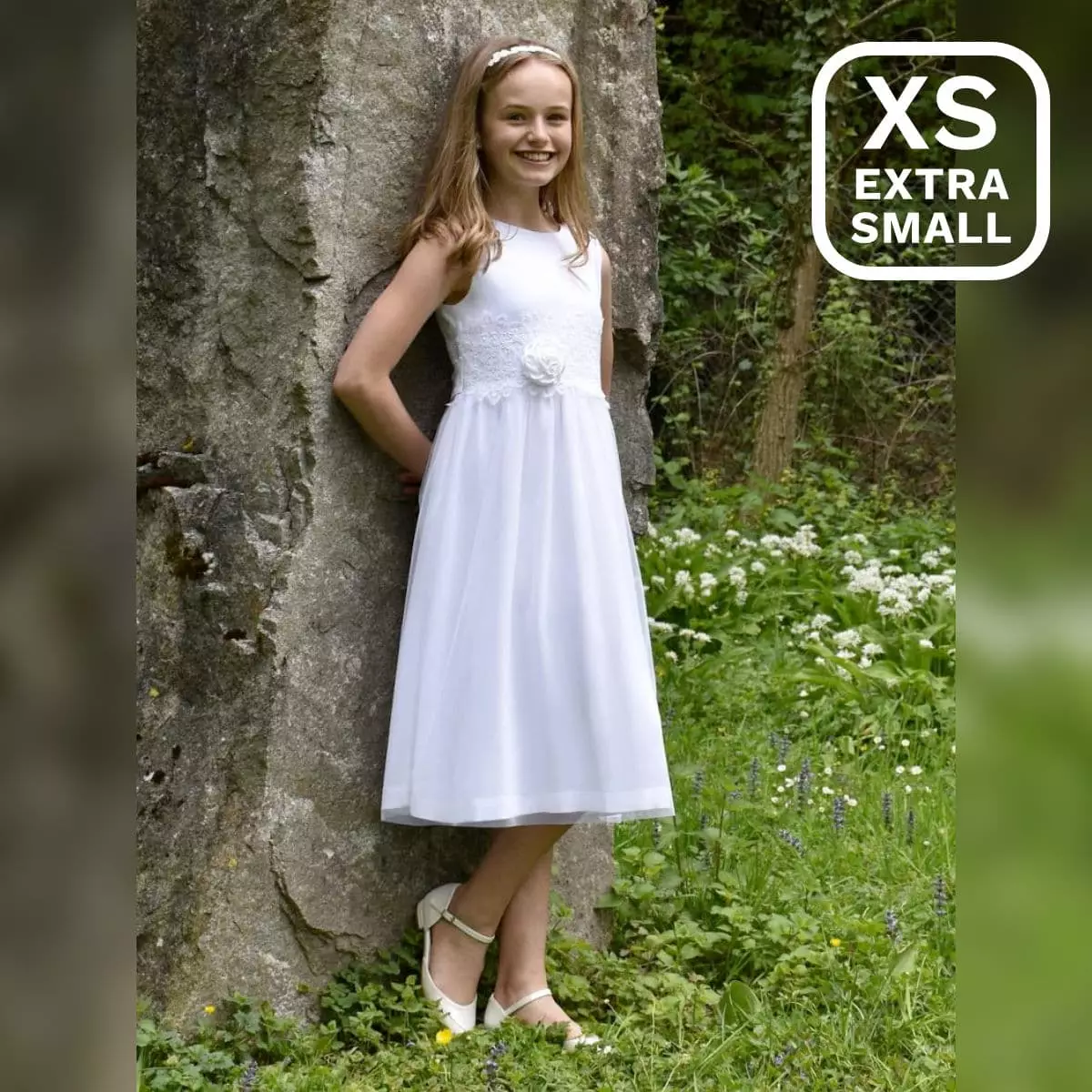 Schlichtes, mädchenhaftes und dennoch verspieltes Kommunionkleid „Clara“ von Miolilou. Das Kleid ohne Ärmel besteht aus hochwertiger Viskose in Farbe Weiß, der Rock ist mit einer dünnen Schicht Tüll verziert. Der Oberstoff und das Futter bestehen aus 100% Viskose. Viskose ist fließend und hat dennoch eine Festigkeit, die das Kleid zu einem richtig schönen festlichen Blumenmädchen-Kleid macht. Es besitzt einen Reißverschluss am Rücken und wird mithilfe eines Gürtels aus Spitze gebunden. Eine Rose aus Chiffon ziert die Taille. Diese lässt sich auf Wunsch abnehmen.