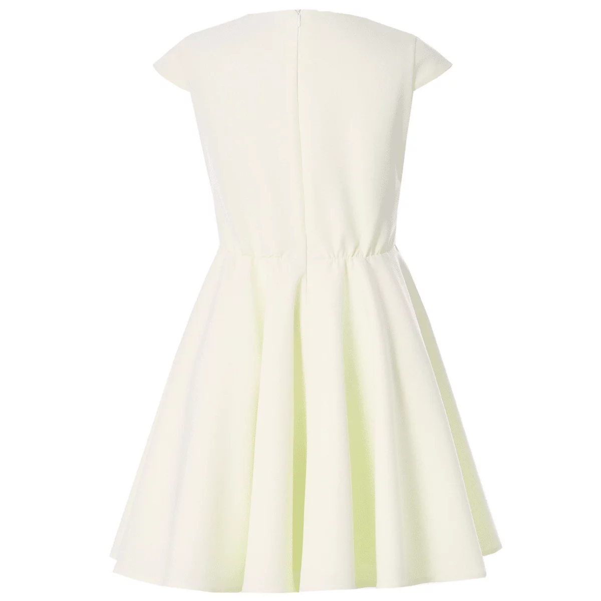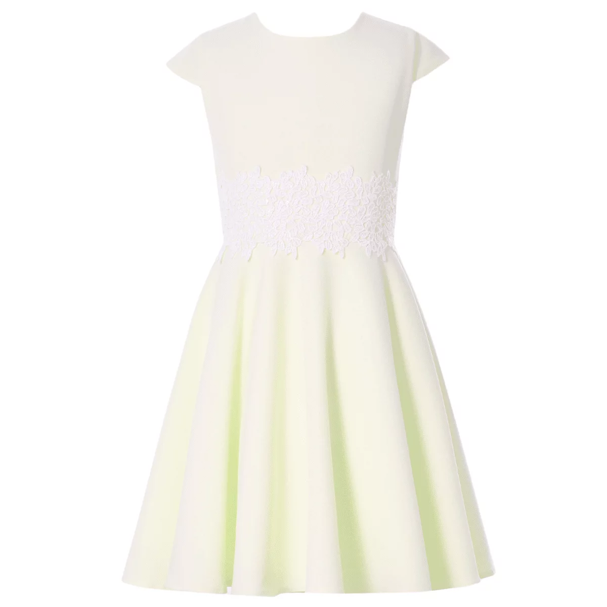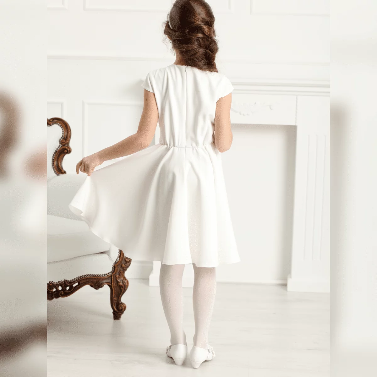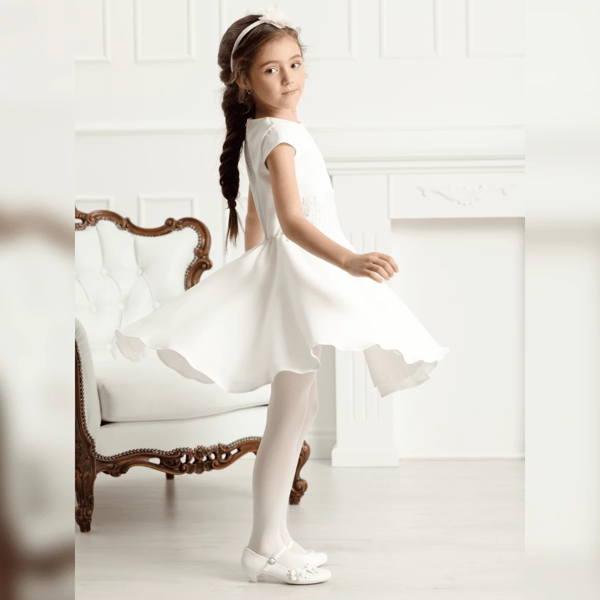 Schickes Mädchenkleid / Kommunionkleid DK-107 von Dalary aus hochwertigem Marchiano-Stoff in Farbe Ivory, der in dieser Saison äußerst beliebt ist. Die Farbe Ivory ist ein Weißton mit einem Schimmer Ecru (Elfenbein). Die Vorderseite des Kleides hat eine dekorative Ecru-Guipure mit Pailletten, die für ein optisches Highlight sorgen. Auf der Rückseite ist das Kleid DK-107 mit einem verdeckten Reißverschluss befestigt und hat ein eingenähtes Gummiband, wodurch das Kleid perfekt zur Figur des Mädchens passt. Dieses kreisförmige Mädchenkleid wurde mit viel Liebe zum Detail hergestellt und ist ideal für die Kommunion, als festliches Kleid oder als Blumenmädchen-Kleid für die Hochzeit geeignet. In diesem knielangen Kleid ohne Ärmel wird Deine Prinzessin sich wohl fühlen und elegant aussehen.
