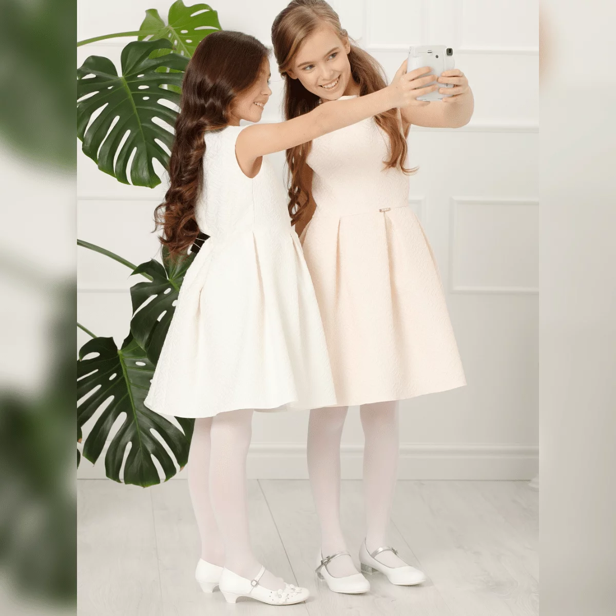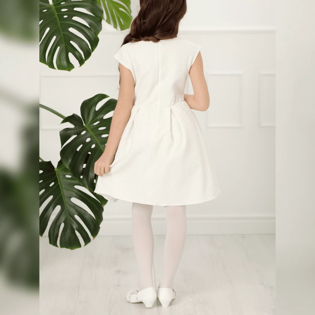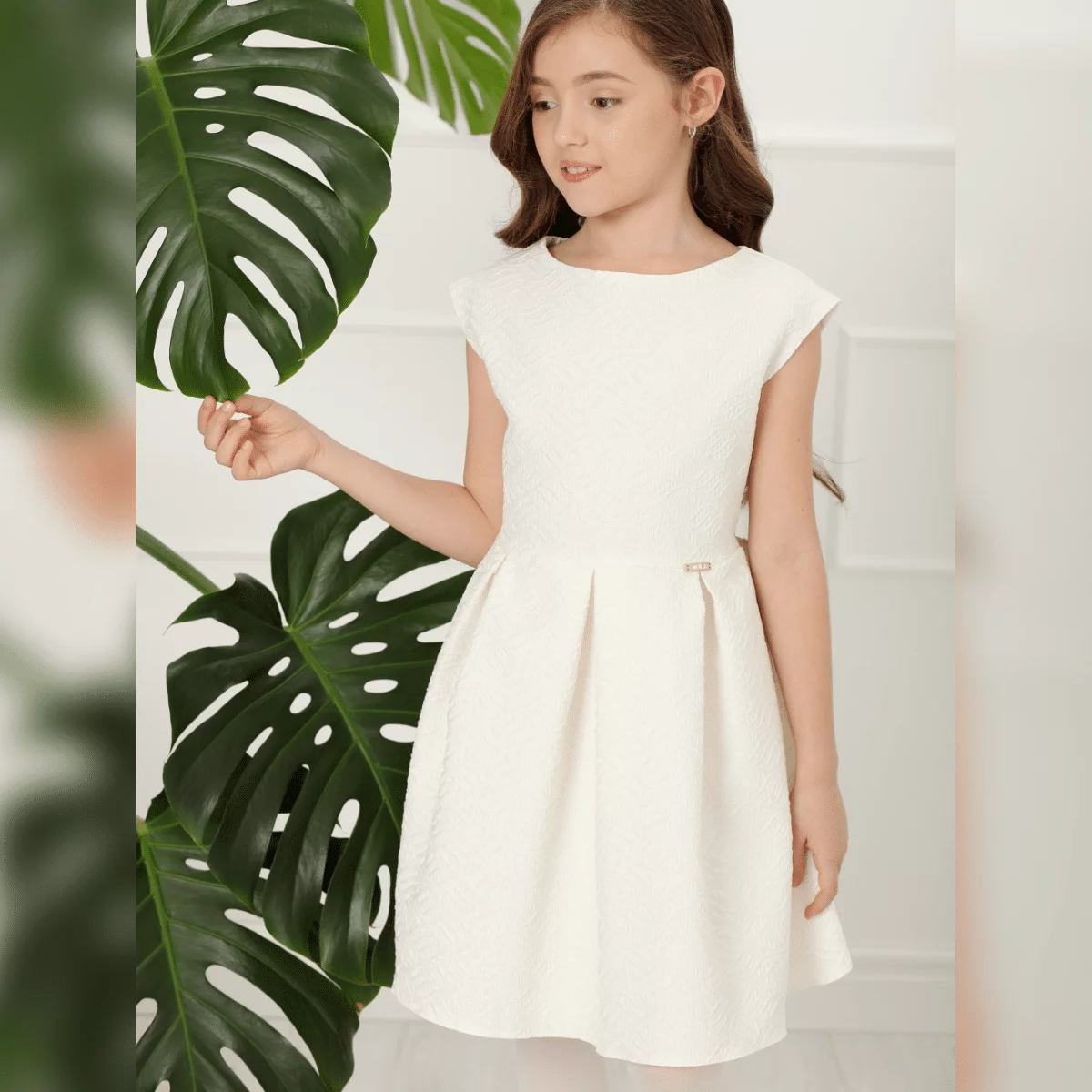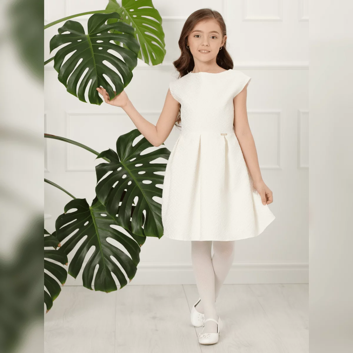 Wunderschönes Mädchenkleid / Kommunionkleid DK-112 von Dalary aus feinem Jacquard-Stoff in Farbe Ivory. Die Farbe Ivory ist ein Weißton mit einem Schimmer Ecru (Elfenbeinfarbe). Das Kleid ist mit einer schönen dekorativen Brosche verziert, die in der Taille eingenäht ist. Auf der Rückseite ist das Kleid DK-112 mit einem verdeckten Reißverschluss befestigt und hat ein eingenähtes Gummiband, wodurch das Kleid perfekt zur Figur des Mädchens passt. Ein schönes, ärmelloses Mädchenkleid, welches ideal für die Kommunion, als festliches Kleid oder als Blumenmädchen-Kleid für die Hochzeit gut geeignet ist. In diesem hellen Kleid wird Deine Prinzessin sich wohl fühlen und elegant aussehen.