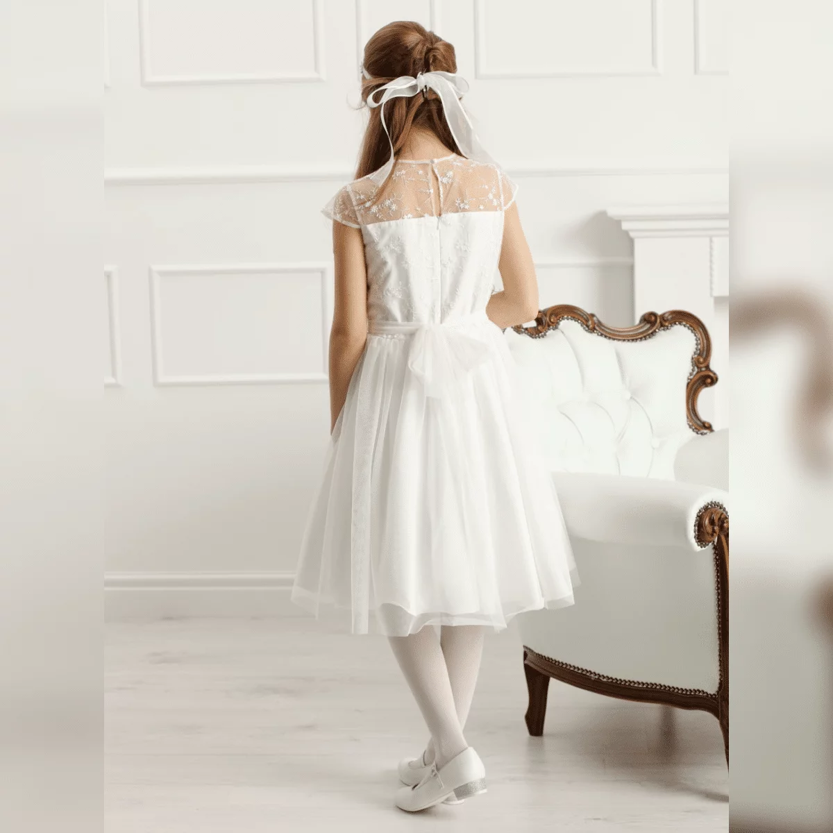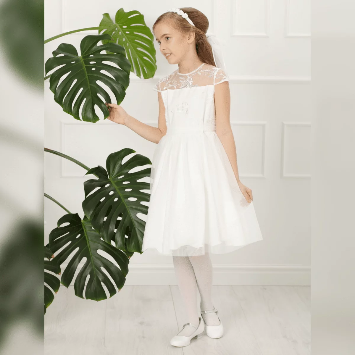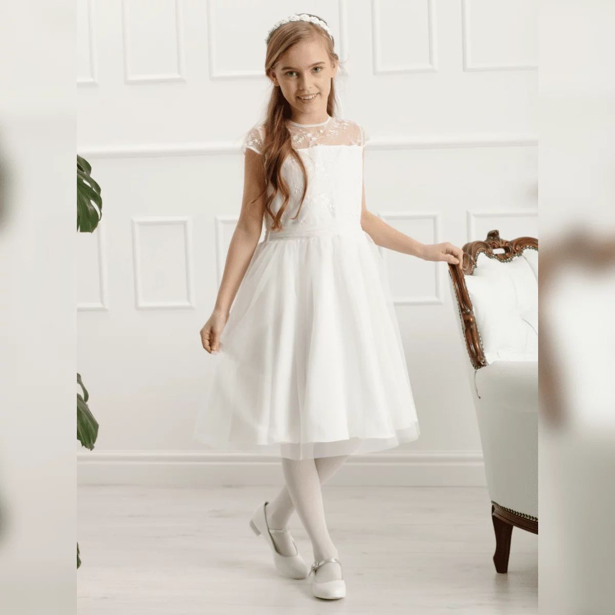 Wunderschönes Mädchenkleid / Kommunionkleid DK-115 von Dalary aus hochwertigem Satin, Spitze und Tüll in der Farbe Ivory. Die Farbe Ivory ist ein Weißton mit einem Schimmer Ecru (Elfenbein). Die Oberseite des Kleides besteht aus zarter Spitze in Farbe Ivory mit einer leicht durchsichtigen Passe. Die Unterseite des Kleides besteht aus drei Schichten – Ecru-Tüll auf Satin und einem Leinen-Baumwollfutter, das zusätzlich mit Tüll veredelt ist. Auf der Rückseite ist das Kleid DK-115 mit einem Knopf und verdeckten Reißverschluss befestigt und mit einer schönen Schleife aus Tüll gebunden, wodurch das Kleid perfekt zur Figur des Mädchens passt. Dieses knielange Mädchenkleid mit kurzen Ärmel besteht aus einem Kreis, dank dessen es sich beim Tanzen wunderschön dreht. Es wurde mit viel Liebe zum Detail hergestellt und ist ideal für die Kommunion, als festliches Kleid oder als Blumenmädchen-Kleid für die Hochzeit geeignet. Deine Prinzessin wird sich in diesem Kleid wohl fühlen und elegant aussehen.