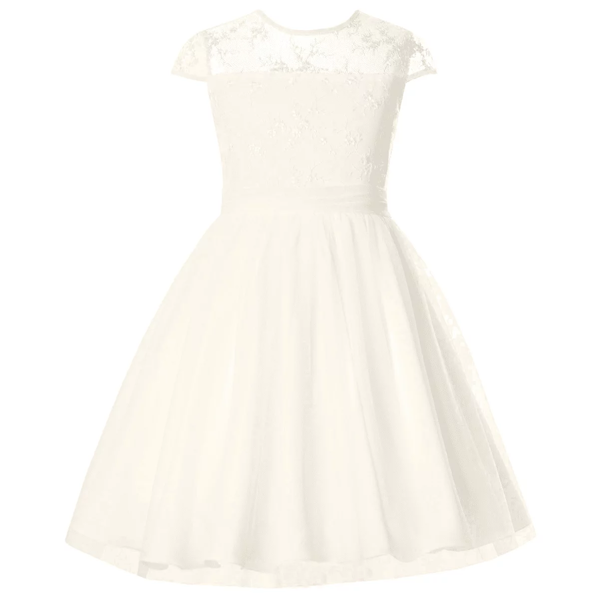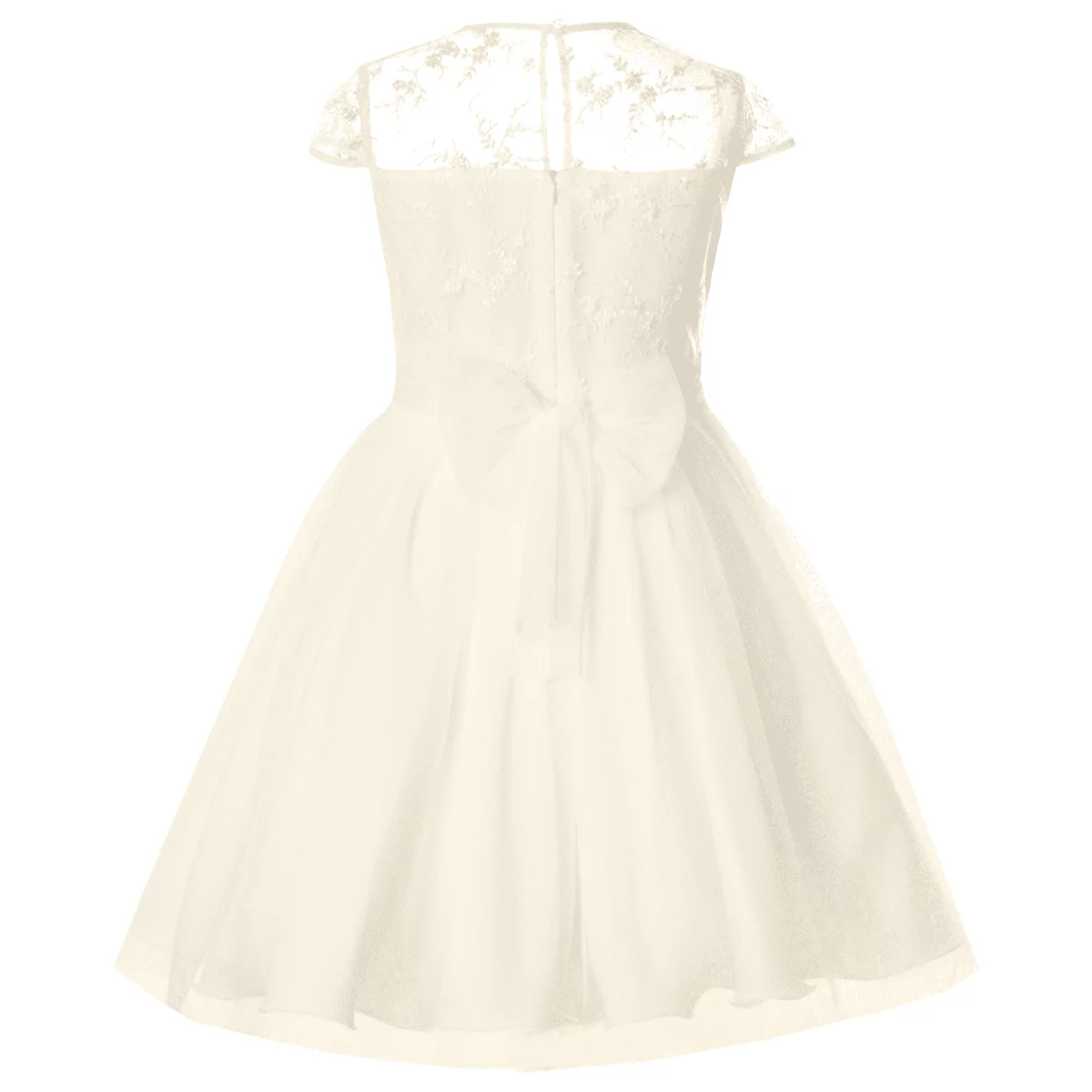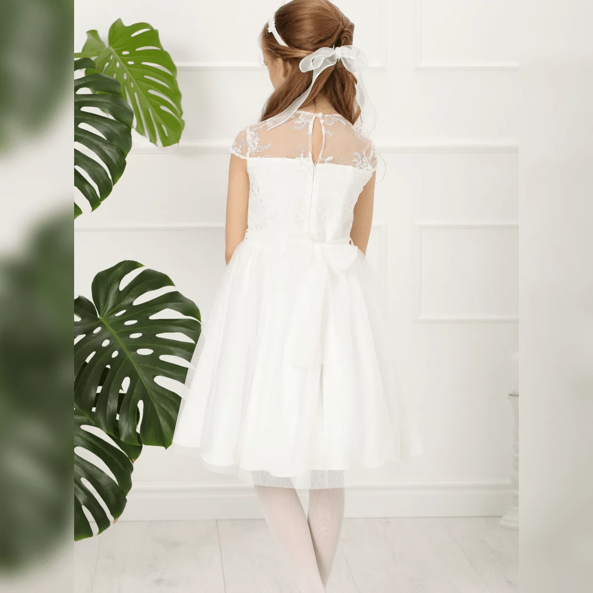 Wunderschönes Mädchenkleid / Kommunionkleid DK-115 von Dalary aus hochwertigem Satin, Spitze und Tüll in der Farbe Ivory. Die Farbe Ivory ist ein Weißton mit einem Schimmer Ecru (Elfenbein). Die Oberseite des Kleides besteht aus zarter Spitze in Farbe Ivory mit einer leicht durchsichtigen Passe. Die Unterseite des Kleides besteht aus drei Schichten – Ecru-Tüll auf Satin und einem Leinen-Baumwollfutter, das zusätzlich mit Tüll veredelt ist. Auf der Rückseite ist das Kleid DK-115 mit einem Knopf und verdeckten Reißverschluss befestigt und mit einer schönen Schleife aus Tüll gebunden, wodurch das Kleid perfekt zur Figur des Mädchens passt. Dieses knielange Mädchenkleid mit kurzen Ärmel besteht aus einem Kreis, dank dessen es sich beim Tanzen wunderschön dreht. Es wurde mit viel Liebe zum Detail hergestellt und ist ideal für die Kommunion, als festliches Kleid oder als Blumenmädchen-Kleid für die Hochzeit geeignet. Deine Prinzessin wird sich in diesem Kleid wohl fühlen und elegant aussehen.