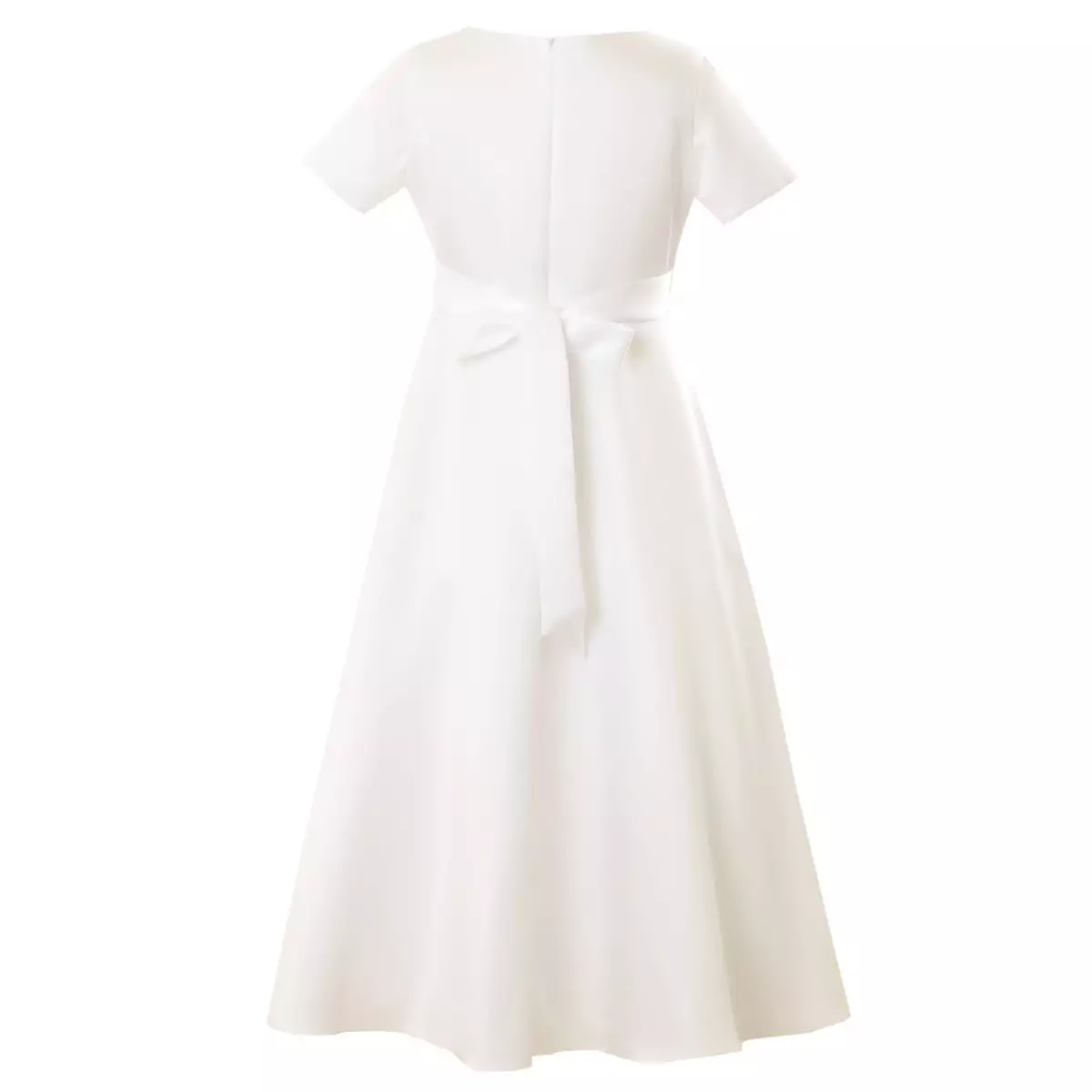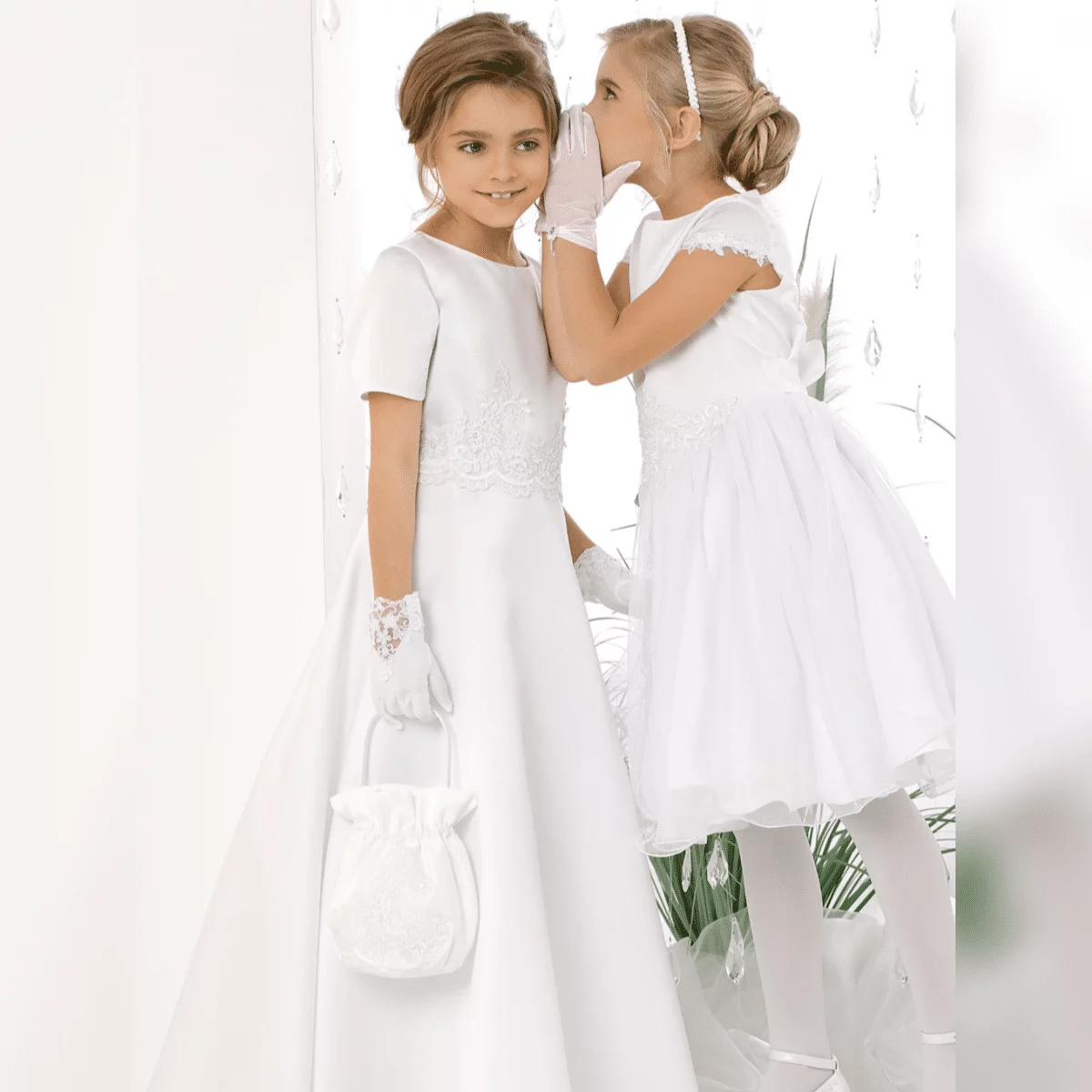 Hübsches Mädchenkleid / Kommunionkleid DK-202 von Dalary aus hochwertigem Satin in der Farbe Weiß. Das Kleid ist ausgestellt und mit wunderschönen Applikation mit Perlen in der Taille versehen. Die Unterseite des Kleides besteht aus einem Leinen-Baumwollfutter, das zusätzlich mit Tüll veredelt ist. Auf der Rückseite ist das Kleid DK-202 mit einem verdeckten Reißverschluss befestigt und mit einer schönen Schleife aus Satin gebunden, wodurch das Kleid perfekt zur Figur des Mädchens passt. Dieses bodenlange Mädchenkleid mit kurzen Ärmel aus der Kollektion 2021 ist besonders elegant. Es wurde mit viel Liebe zum Detail hergestellt und ist ideal für die Kommunion, als festliches Kleid oder als Blumenmädchen-Kleid für die Hochzeit geeignet. Deine Prinzessin wird sich in diesem Kleid wohl fühlen und elegant aussehen.