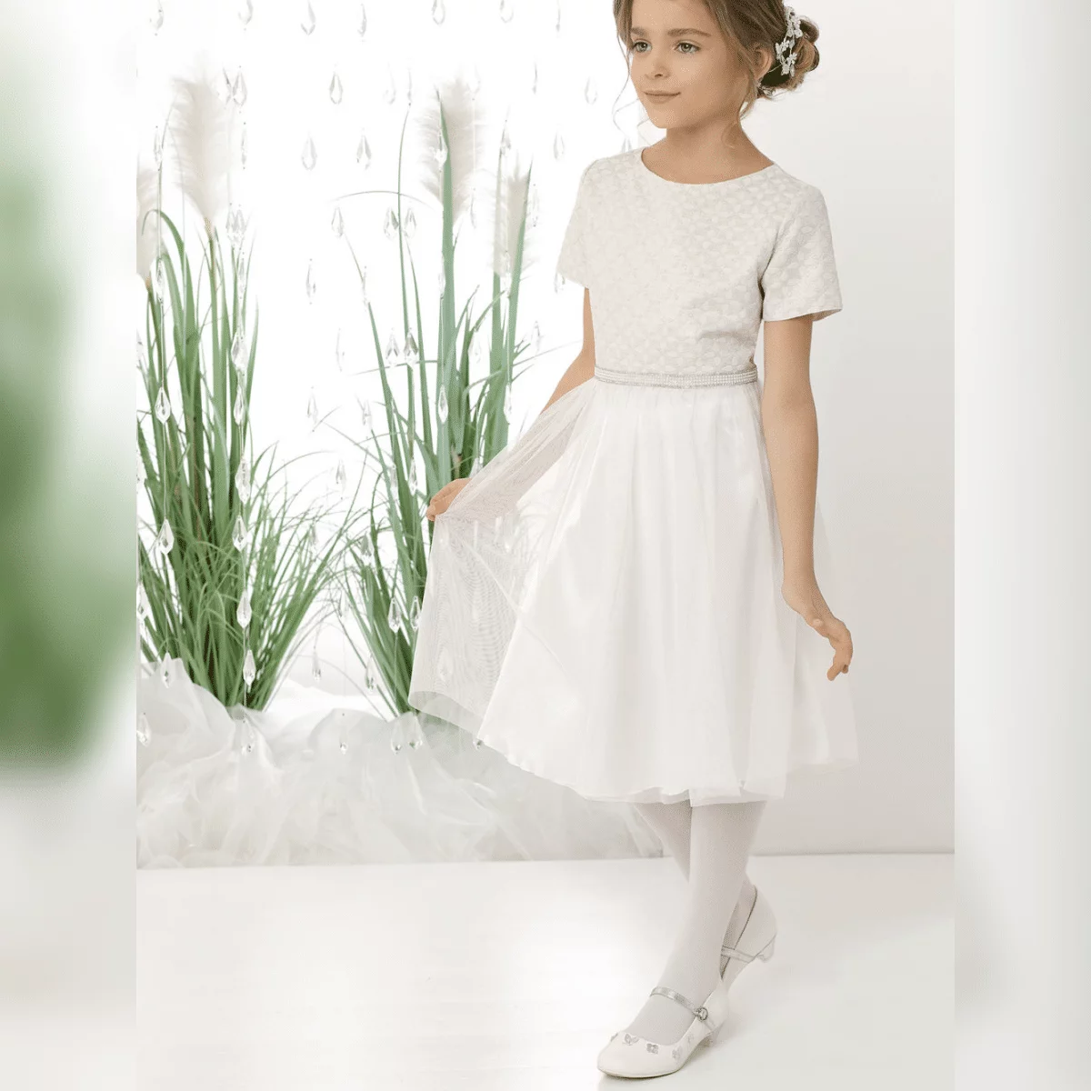 Hübsches Mädchenkleid / Kommunionkleid DK-210 von Dalary. Die Oberseite des Kleides besteht aus hochwertigem Jacquard-Stoff in der Farbe Ivory, der mit goldenen Blumen auf einem Baumwollfutter verziert ist. Die Farbe Ivory ist ein Weißton mit einem Schimmer Ecru (Elfenbeinfarbe). Die Unterseite des Kleides besteht aus glänzendem Satin, das zusätzlich mit Tüll veredelt ist. Auf der Rückseite ist das Kleid DK-210 mit einem verdeckten Reißverschluss befestigt und mit einem wunderschönen Gürtel mit Ziersteinen gebunden, wodurch das Kleid perfekt zur Figur des Mädchens passt. Dieses knielange Mädchenkleid mit kurzen Ärmel aus der Kollektion 2021 ist besonders elegant und kommt mit einem Gürtel, welches mit Ziersteinen verziert ist. Es wurde mit viel Liebe zum Detail hergestellt und ist ideal für die Kommunion, als festliches Kleid oder als Blumenmädchen-Kleid für die Hochzeit geeignet. Deine Prinzessin wird sich in diesem Kleid wohl fühlen und elegant aussehen.