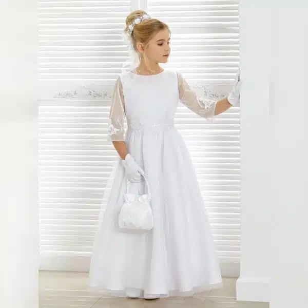 Wunderschönes Kleid für die Kommunion oder als schickes Blumenmädchen für die Hochzeitsfeier. Das Kleid DK-218 aus der neuen Kollektion von Dalary überzeugt durch ein einzigartiges Design und hochwertige Verarbeitung. Da werden die Augen Deiner kleinen Prinzessin vor Freude strahlen! Das Oberteil des Kleides besteht aus Satin und Tüll in Farbe Weiß. Innen besteht das Mädchenkleid aus einem feinen Leinen-Baumwollfutter, das zusätzlich mit Tüll veredelt ist. Eine schöne dekorative Applikation in der Taille und den 3/4 Ärmel ergänzt das Kleid und verleiht ihm das gewisse Etwas. Dieses Modell ist bodenlang und schließt auf Höhe der Knöchel ab. Hinten wird das Kleid mit einem verdeckten Reißverschluss geschlossen und in einer schönen Satinschleife gebunden. Dadurch sitzt das Kleid DK-218 perfekt und betont die Figur. Zu diesem Kleid empfehlen passende Handschuhe und eine Handtasche in Farbe Weiß.