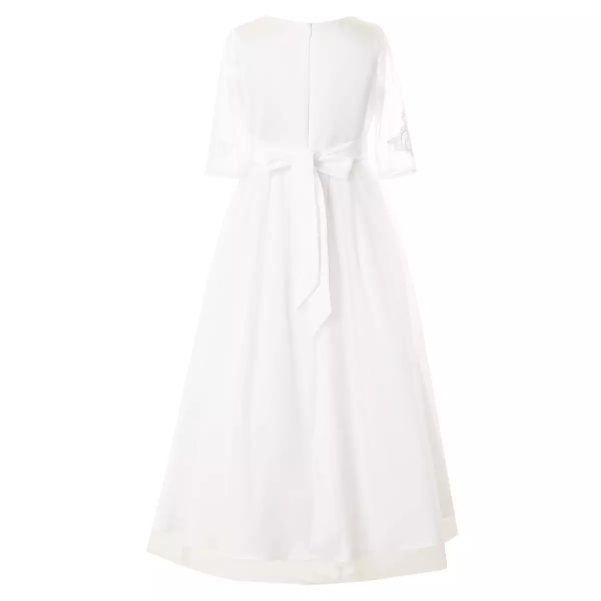 Wunderschönes Kleid für die Kommunion oder als schickes Blumenmädchen für die Hochzeitsfeier. Das Kleid DK-218 aus der neuen Kollektion von Dalary überzeugt durch ein einzigartiges Design und hochwertige Verarbeitung. Da werden die Augen Deiner kleinen Prinzessin vor Freude strahlen! Das Oberteil des Kleides besteht aus Satin und Tüll in Farbe Weiß. Innen besteht das Mädchenkleid aus einem feinen Leinen-Baumwollfutter, das zusätzlich mit Tüll veredelt ist. Eine schöne dekorative Applikation in der Taille und den 3/4 Ärmel ergänzt das Kleid und verleiht ihm das gewisse Etwas. Dieses Modell ist bodenlang und schließt auf Höhe der Knöchel ab. Hinten wird das Kleid mit einem verdeckten Reißverschluss geschlossen und in einer schönen Satinschleife gebunden. Dadurch sitzt das Kleid DK-218 perfekt und betont die Figur. Zu diesem Kleid empfehlen passende Handschuhe und eine Handtasche in Farbe Weiß.