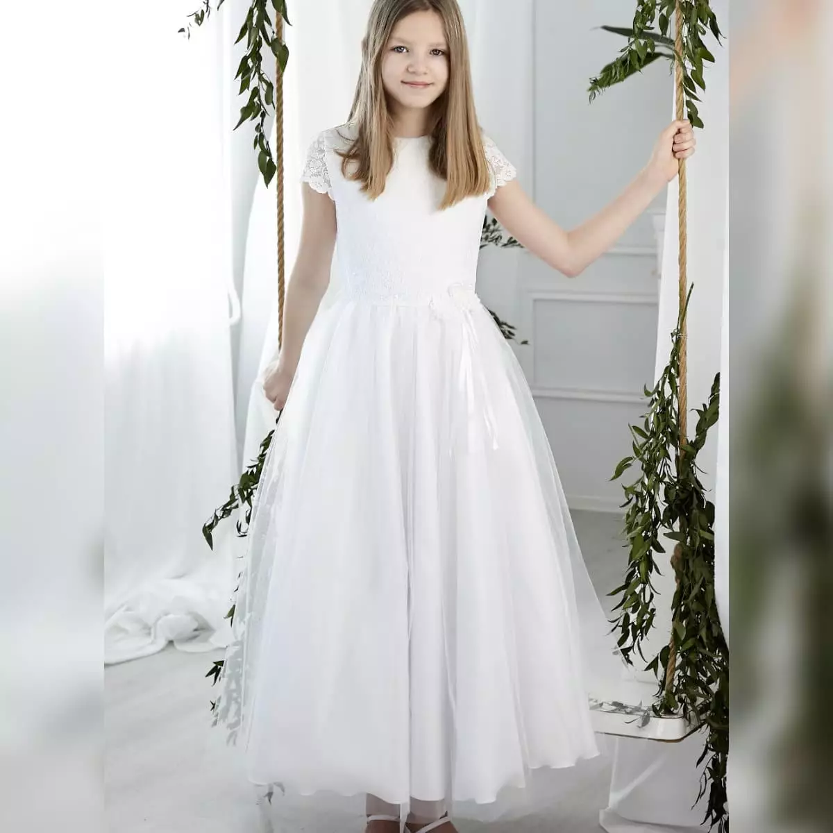 Elegantes Kommunionkleid Dalary DK-223 in der Farbe Weiß aus der Kollektion 2022. Das Oberteil des Kleides besteht aus hochwertiger Spitze mit einer Verzierung aus kleinen Punkten und einem Blumenmuster. Das Kleid wird mit einer Schärpe an der Taille gebunden und kann zusätzlich mit einem Reißverschluss am Rücken geöffnet werden. Die Schärpe ist an der Taille mit wunderschönen Blumen verziert, die das Kleid elegant abrunden. Das Unterteil besteht aus leichtem Tüll in einer erstklassigen Qualität. Ein wunderschönes Modell für die Kommunion, Hochzeiten und andere Events! Zu dem Kleid DK-223 empfehlen wir passende Accessoires und Kommunionschuhe in der Farbe Weiß.
