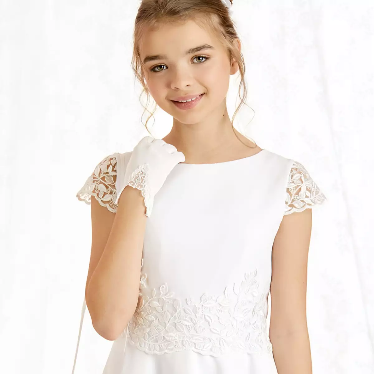 Wunderschönes Kommunionkleid DK-300 aus der Kollektion 2022 von Dalary. Das Kleid besteht aus hochwertigem Barbi-Stoff in Farbe Weiß. Die Vorderseite des Kleides hat eine dekorative Guipure in Farbe Weiß mit stylischen Pailletten. Die zarten kurzen Ärmel aus Spitze ergänzen ideal das schicke Kleid. Das knielange Mädchenkleid hat hinten in der Taille einen eingenähten Gummizug, der das Kleid perfekt an die Figur des Mädchens anpasst. Es wird mit einem verdeckten Reißverschluss auf der Rückseite geschlossen.
