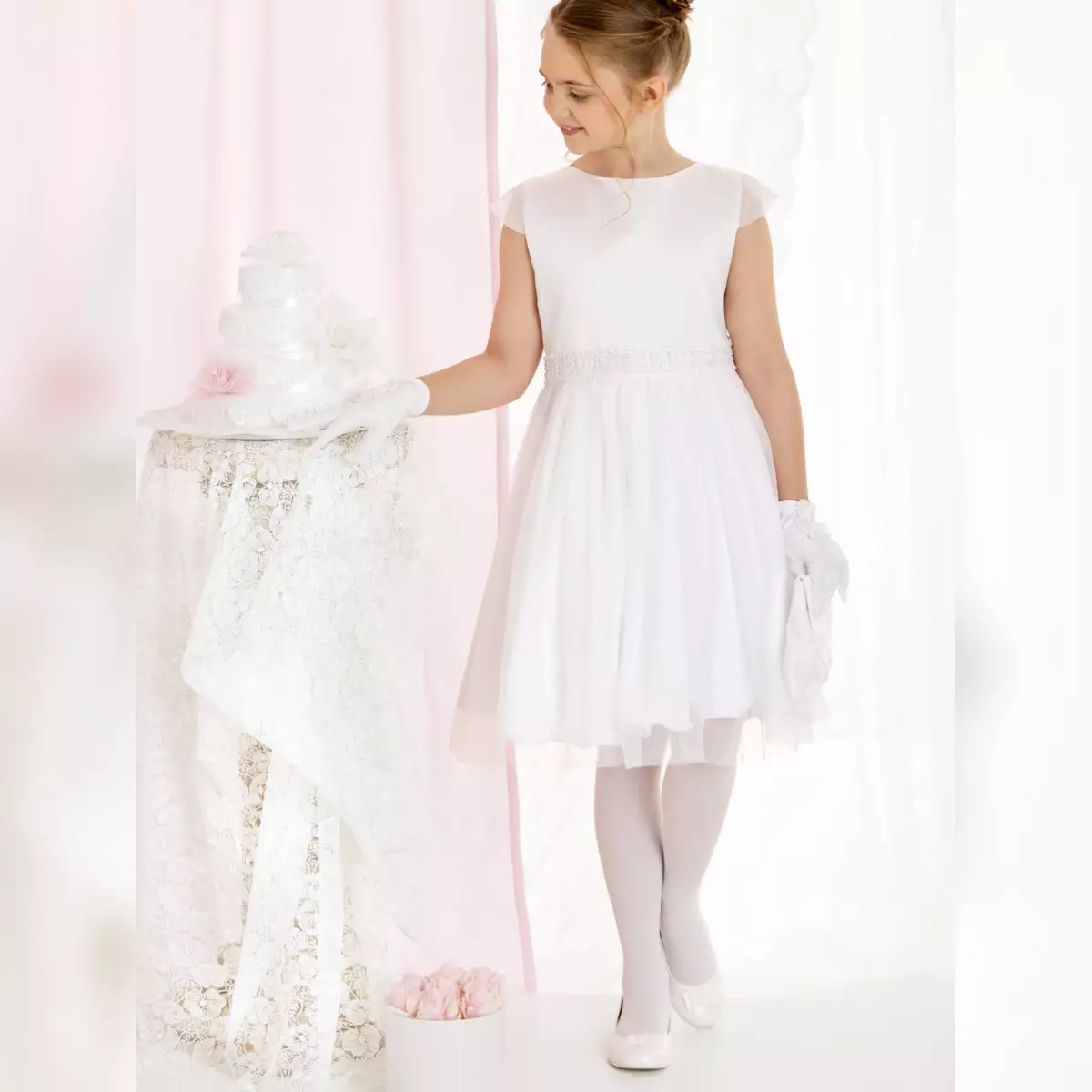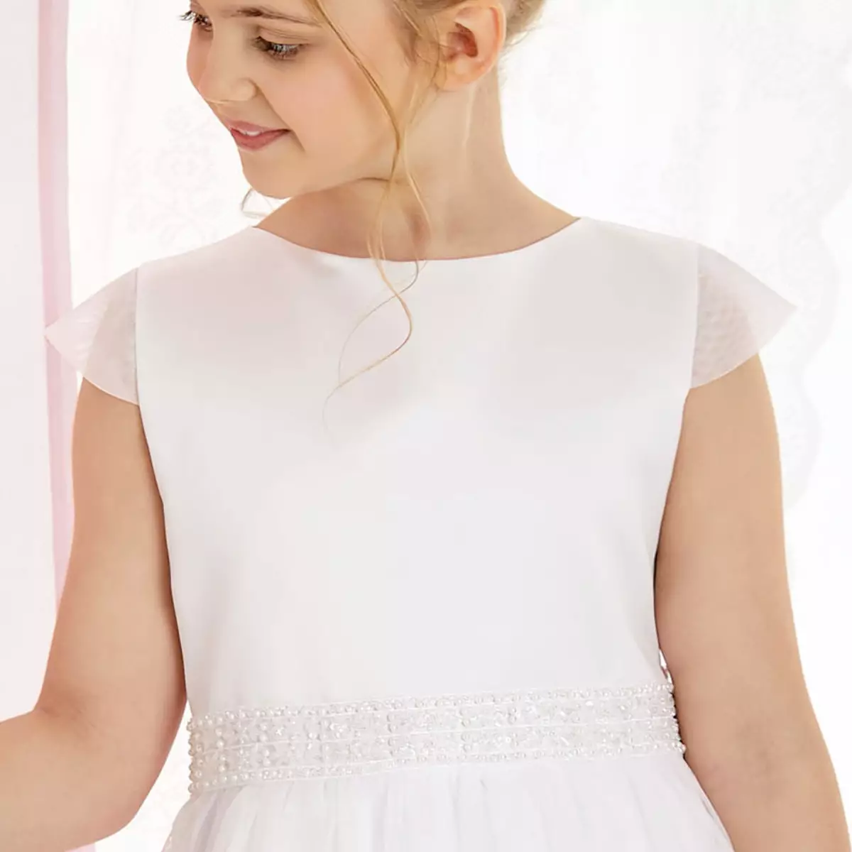 Wunderschönes Kleid für die Erstkommunion DK-314 aus hochwertigem Satin, wahlweise in den Farben Weiß oder Ivory (Elfenbeinfarbe). Das Kleid aus der Kollektion 2022 hat schöne Perlenapplikation in der Taille und zarte Tüll Ärmel. Die Unterseite des Kleides besteht aus drei Lagen weißem Tüll auf Satin und einem Leinen-Baumwollfutter, das zusätzlich mit Tüll veredelt ist. Hinten wird das Kleid mit einem verdeckten Reißverschluss geschlossen und mit einer schönen Schleife gebunden.