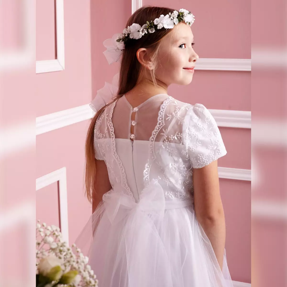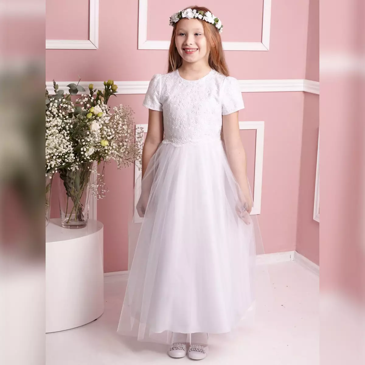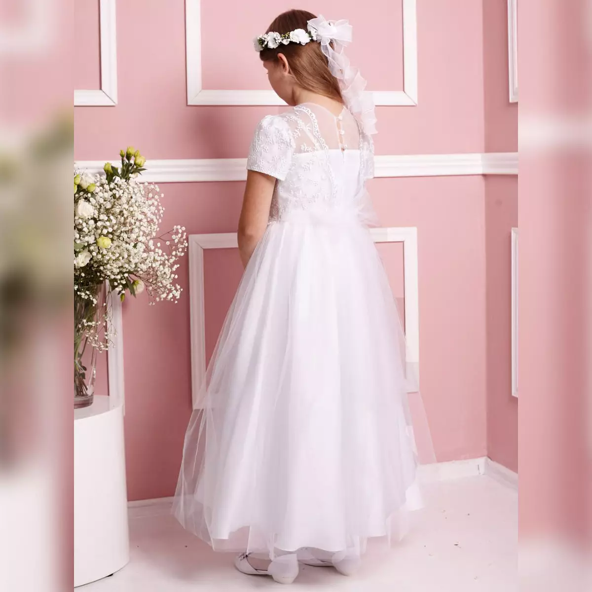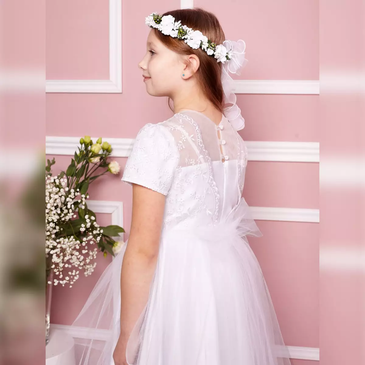 Das Modell DK-410 ist ein wunderschönes Kommunionkleid für Mädchen in Farbe Weiß aus der Kollektion 2023. Das Oberteil besteht aus zarter Spitze, die mit Blumenschmuck verziert ist. Das knöchellange Unterteil des Kommunionkleids besteht aus leichtem Tüll und sieht besonders elegant aus! In der Taille befindet sich eine Schärpe, die hinten mit einer Schleife gebunden wird. Es hat einen dekorativen Rücken mit floralen Verzierungen aus Tüll und Spitze. Zudem wird das Kleid hinten mit einem verdeckten Reißverschluss und dekorativen Knöpfen geschlossen. Kurze Ärmel mit leichtem Puff runden dieses Modell elegant ab und machen es zum wahren Hingucker auf der Erstkommunion, Hochzeit oder einer anderen Feier!