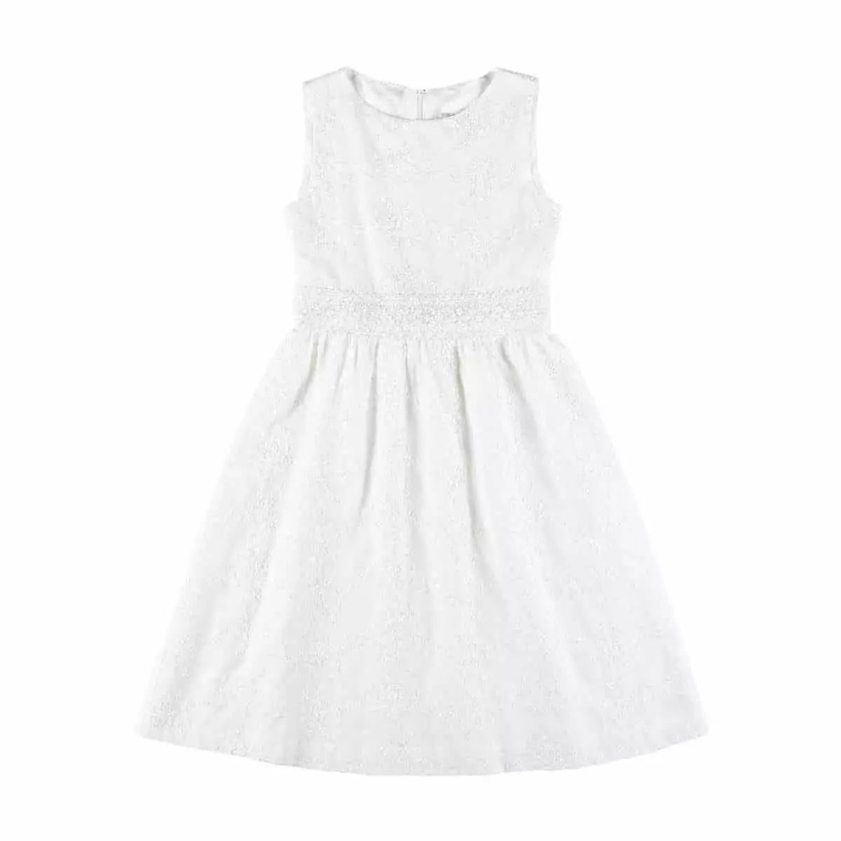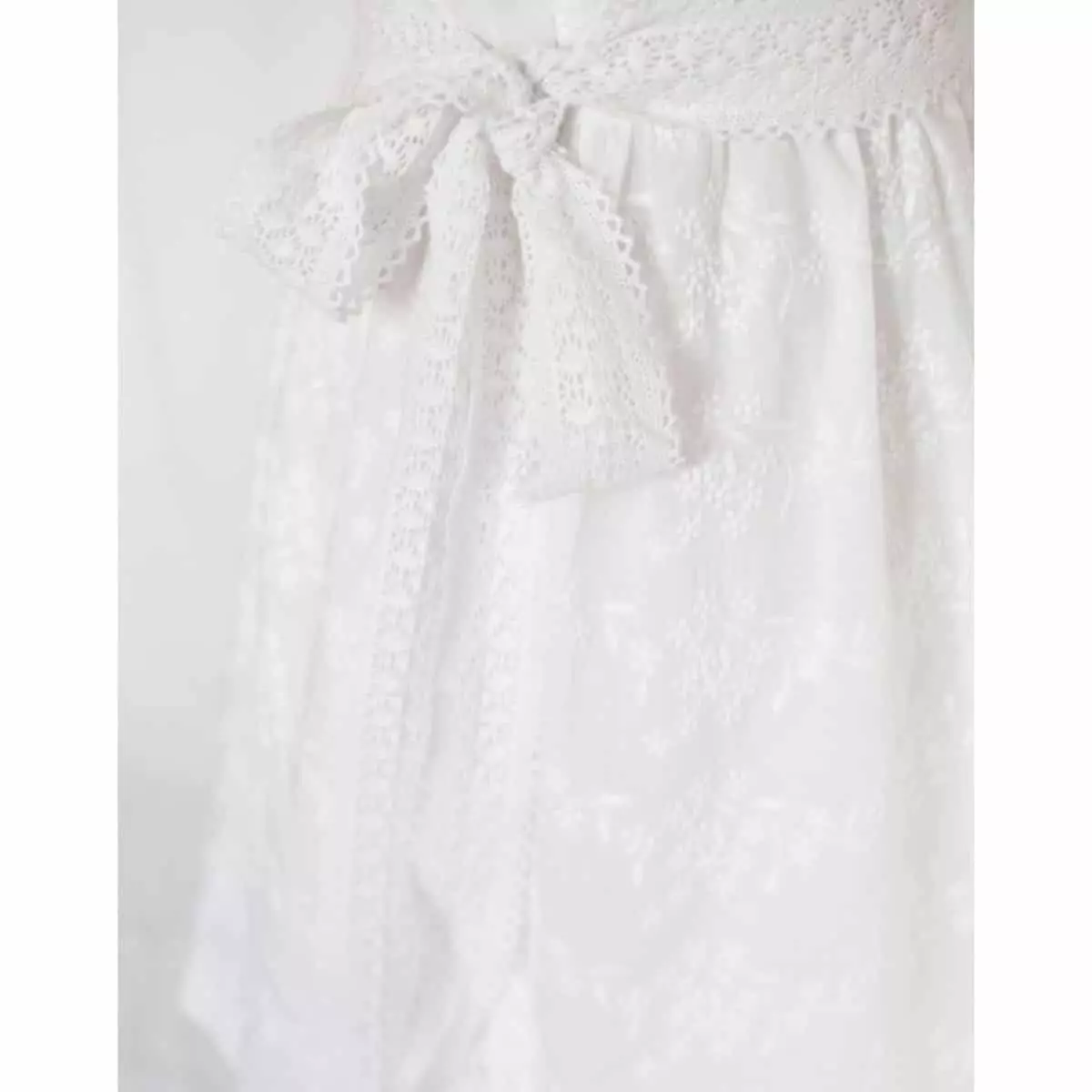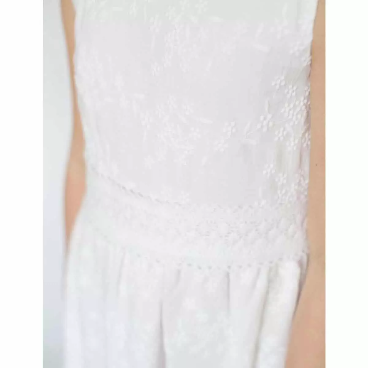 Entzückendes, schlichtes Kommunionkleid „Greta“ von Miolilou in Farbe Weiß im Bohostil. Der Oberstoff besteht aus 100% Baumwolle und ist mit süssen Blümchen bestickt. Das Futter besteht zu 100% aus hochwertiger Viskose (atmungsaktives Naturprodukt). In der Taille wird das Kleidchen durch einen ca. 7 cm breiten Gürtel aus Lochstickerei gebunden. Die Bänder des Gürtels sind sehr lang, so dass hinten eine schöne Schleife mit langen hängenden Enden gebunden werden kann. Das Kleid „Greta weiß“ besitzt einen Reißverschluss am Rücken. Der Rock ist leicht in der Taille angekraust und ausgestellt. Eine abnehmbare Rose aus zartem Satin schmückt dieses schöne Mädchenkleid.