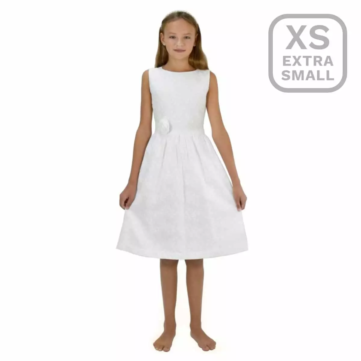 Entzückendes, schlichtes Kommunionkleid „Greta“ von Miolilou in Farbe Weiß im Bohostil. Der Oberstoff besteht aus 100% Baumwolle und ist mit süssen Blümchen bestickt. Das Futter besteht zu 100% aus hochwertiger Viskose (atmungsaktives Naturprodukt). In der Taille wird das Kleidchen durch einen ca. 7 cm breiten Gürtel aus Lochstickerei gebunden. Die Bänder des Gürtels sind sehr lang, so dass hinten eine schöne Schleife mit langen hängenden Enden gebunden werden kann. Das Kleid „Greta weiß“ besitzt einen Reißverschluss am Rücken. Der Rock ist leicht in der Taille angekraust und ausgestellt. Eine abnehmbare Rose aus zartem Satin schmückt dieses schöne Mädchenkleid.