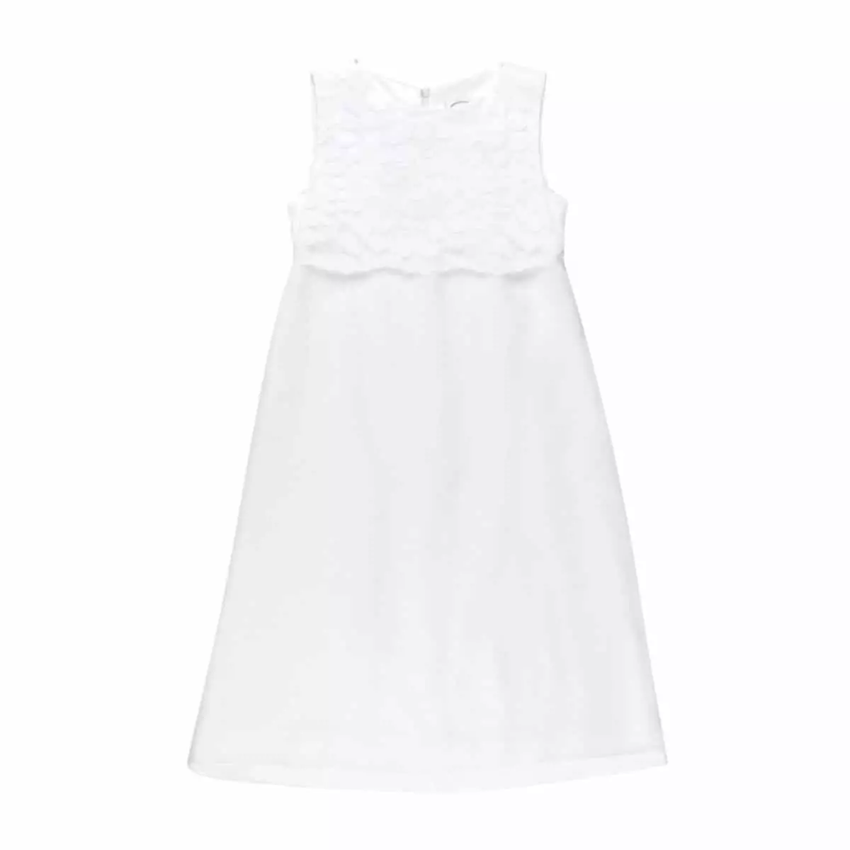 Entzückendes Kommunionkleid „Lena“ von Miolilou in der Farbe Weiß. Dieses schlichte Kleid im Empire Stil besteht aus hochwertiger Viskose mit einem Überrock aus feinem Chiffon. Das Oberteil ist mit einem hochwertigem Spitzenstoff mit Blatt-Muster überzogen, dessen Kante wellenförmig abgeschlossen wird. Im Rücken wird das Mädchenkleid mit zwei Bändern zu einer schönen Schleife zusammengebunden. Das Kleid „Lena“ besitzt einen Reißverschluss am Rücken.