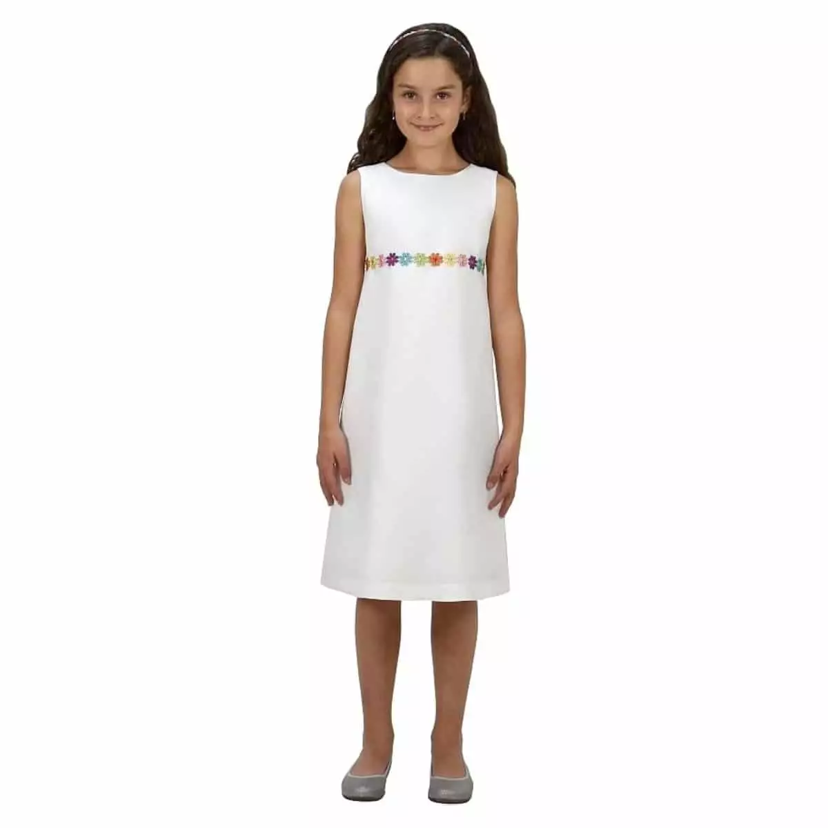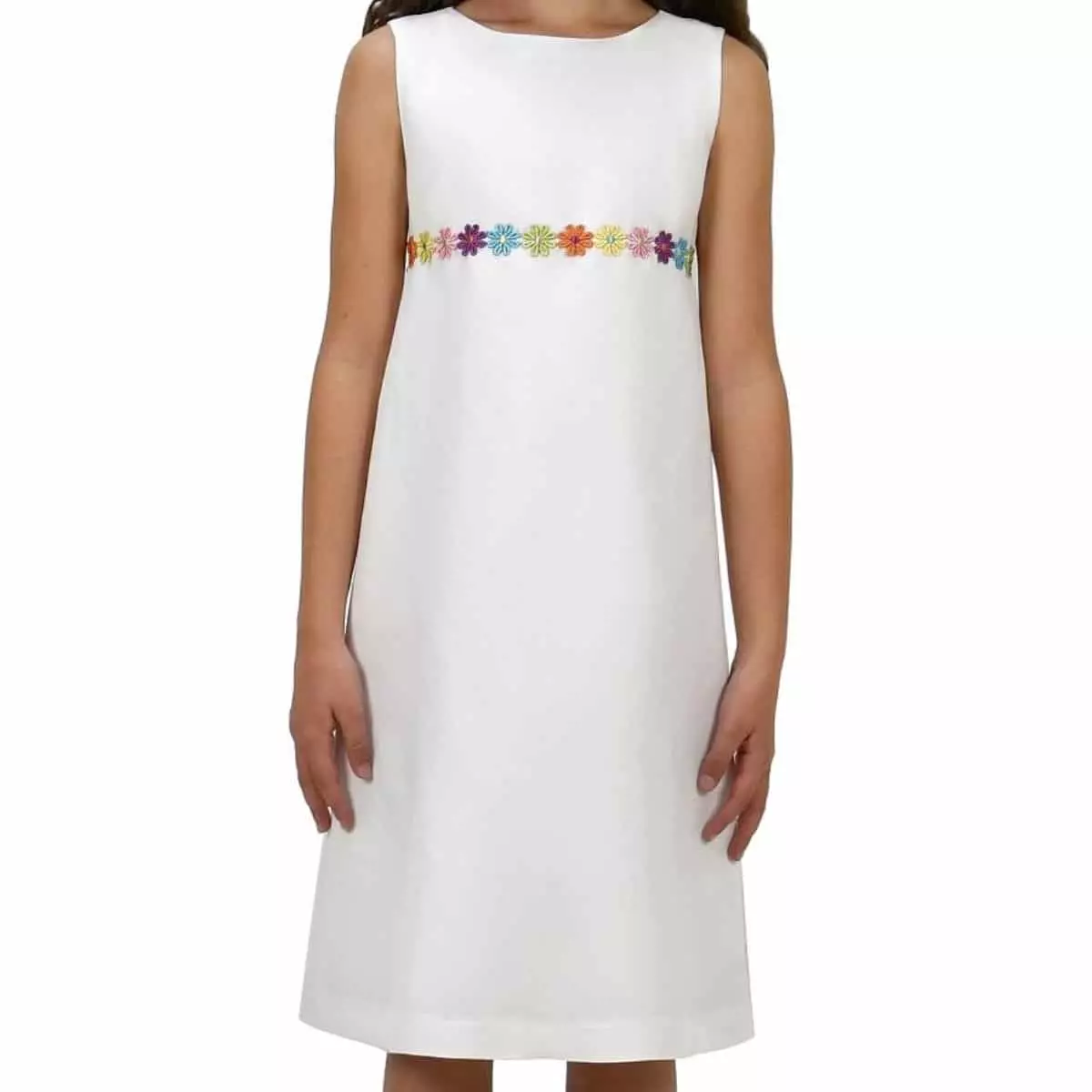 Sehr schönes und schlichtes Kommunionkleid „Maxi“ von Miolilou in Farbe Weiß. Dieses Kleid ist ein eher sportliches und alltagstaugliches Modell ohne Ärmel. Der Oberstoff besteht aus Polyester, Viskose und Spandex (elastisch) und das Futter des Kleides ist aus 100% Viskose. Viskose ist ein atmungsaktives Naturprodukt, sehr griffig, leicht glänzend und trotzdem dezent und nicht knitteranfällig. Dieses Modell ist an der etwas höher angesetzten Taille mit einer bunten Blumenstickeriei verziert. Das Kleid „Maxi weiß“ besitzt einen Reißverschluss am Rücken.