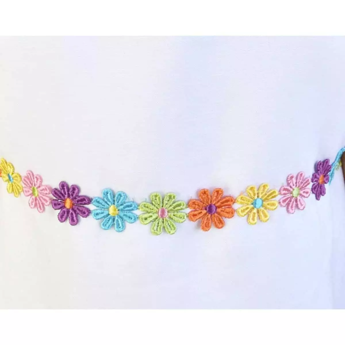 - Mit einer bunten Blumenstickeriei verziert