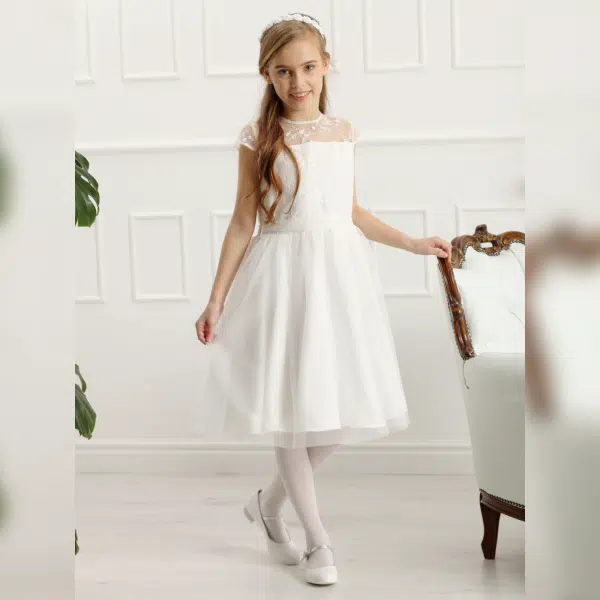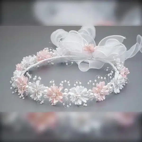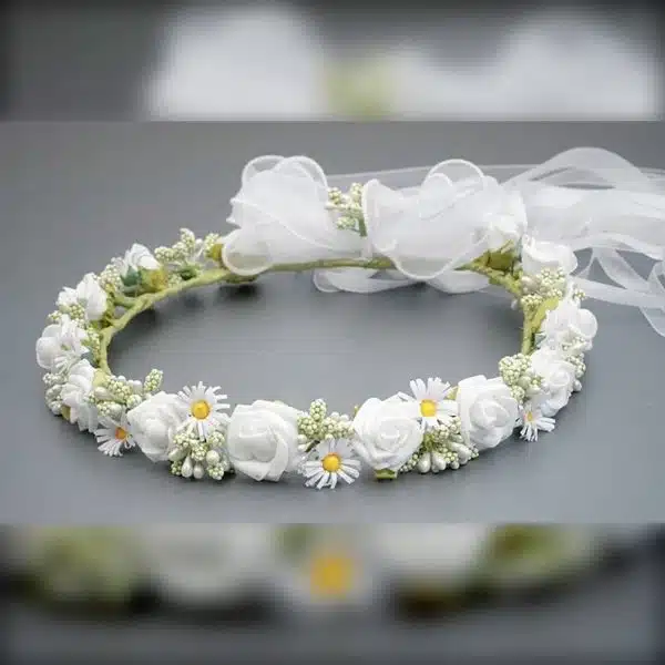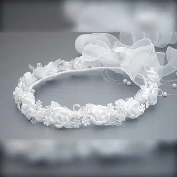 Ein wunderschöner Kommunionkranz DK-A002 von Dalary. Verziert mit künstlichen Blumen in der Farbe weiß und zarten Perlen. Auf der Rückseite befindet sich eine große, handgefertigte Schleife aus Organza. Dieses Haarschmuck wurde speziell für die Erstkommunion und für Blumenmädchen entworfen. Die künstlichen Blumen, aus denen dieser Kranz besteht, wurden mit höchster Präzision und Liebe in Handarbeit gefertigt!