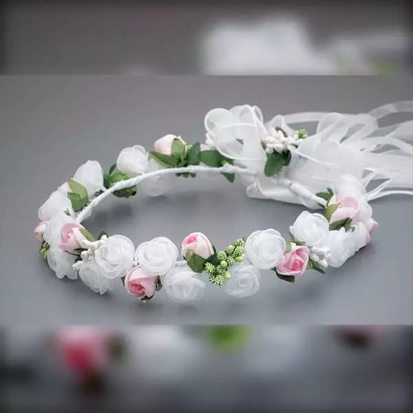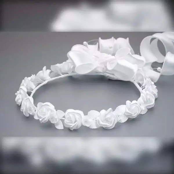 Ein wunderschöner Kommunionkranz DK-A016 von Dalary. Verziert mit künstlichen Blumen und Blättern in der Farbe weiß. Auf der Rückseite befindet sich eine große, handgefertigte Schleife aus Organza. Dieses Haarschmuck wurde speziell für die Erstkommunion und für Blumenmädchen entworfen. Die künstlichen Blumen, aus denen dieser Kranz besteht, wurden mit höchster Präzision und Liebe in Handarbeit gefertigt!